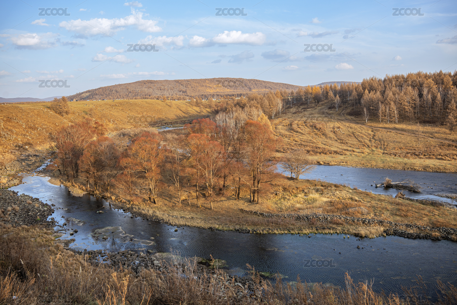 内蒙古阿尔山秋天里的河流和金黄色森林风景