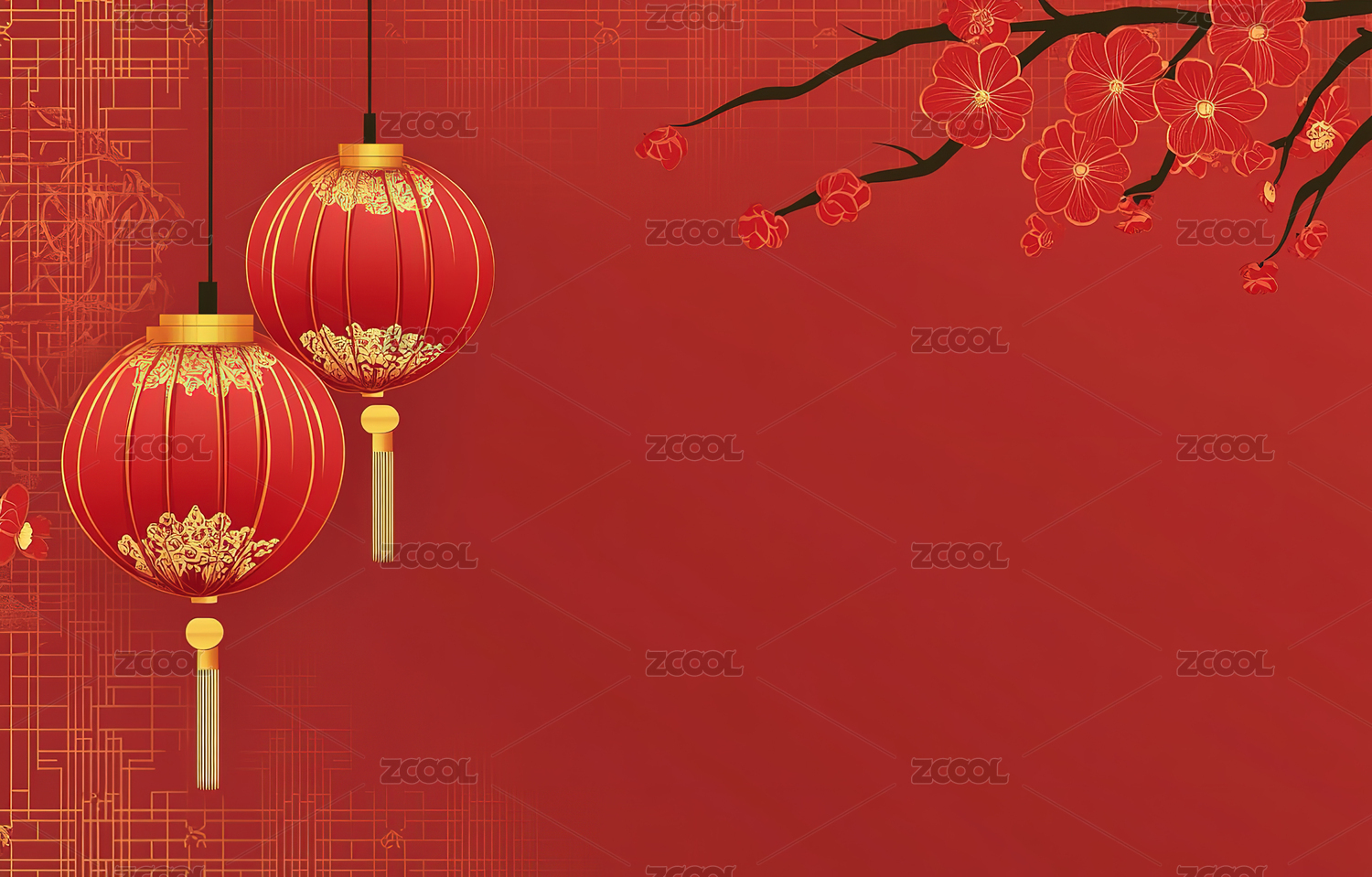 红色背景上的金色花卉与灯笼装饰