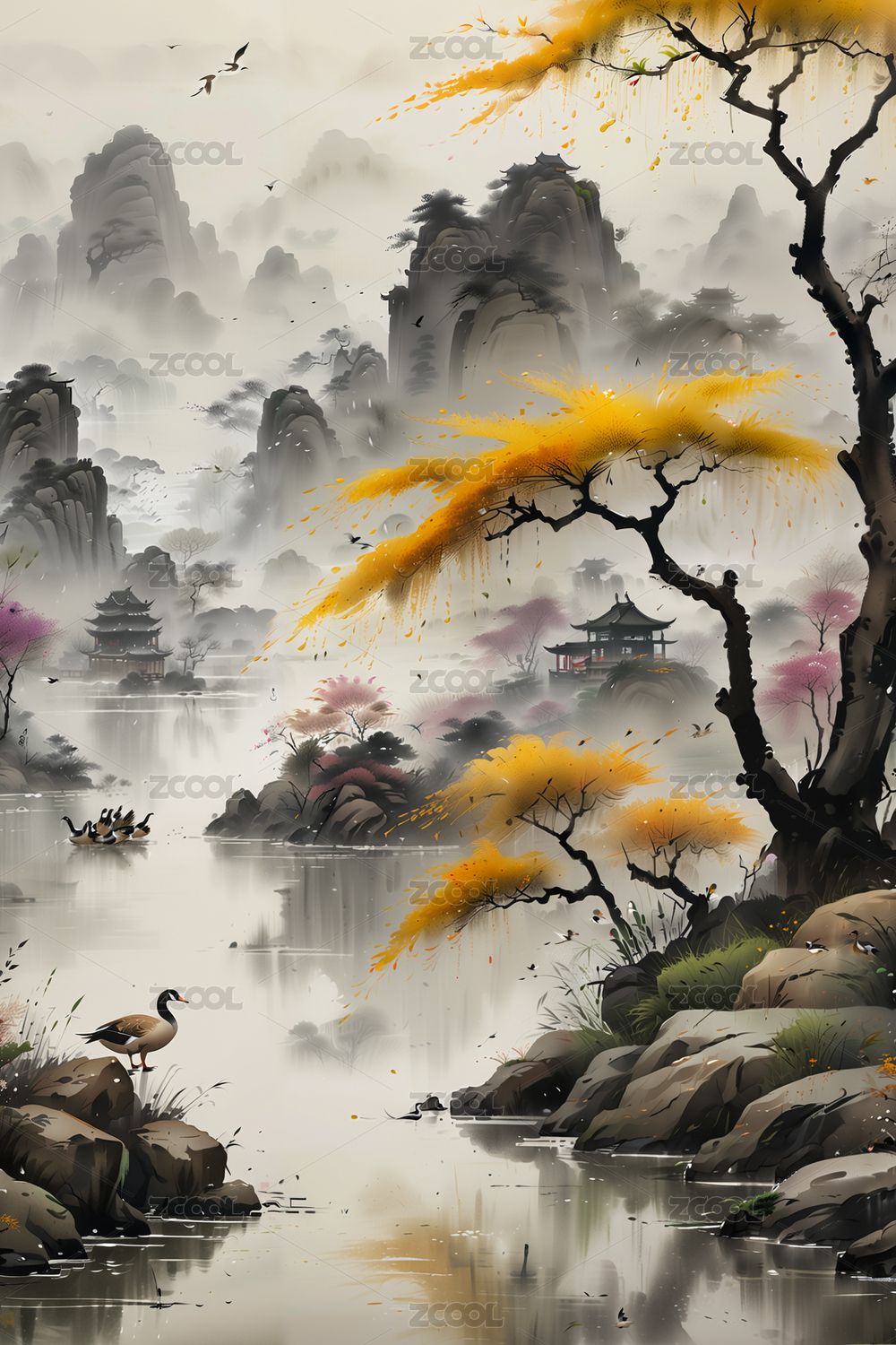 初春,柳叶,细雨,烟雨,花,草,萌芽,露珠,中国风,古风