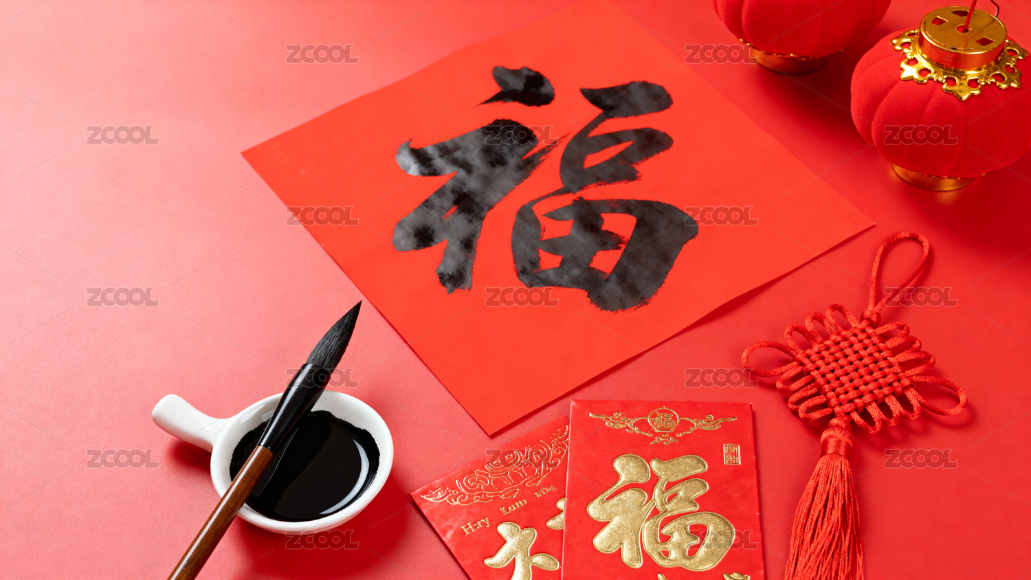 放在桌子上的福字帖和笔墨