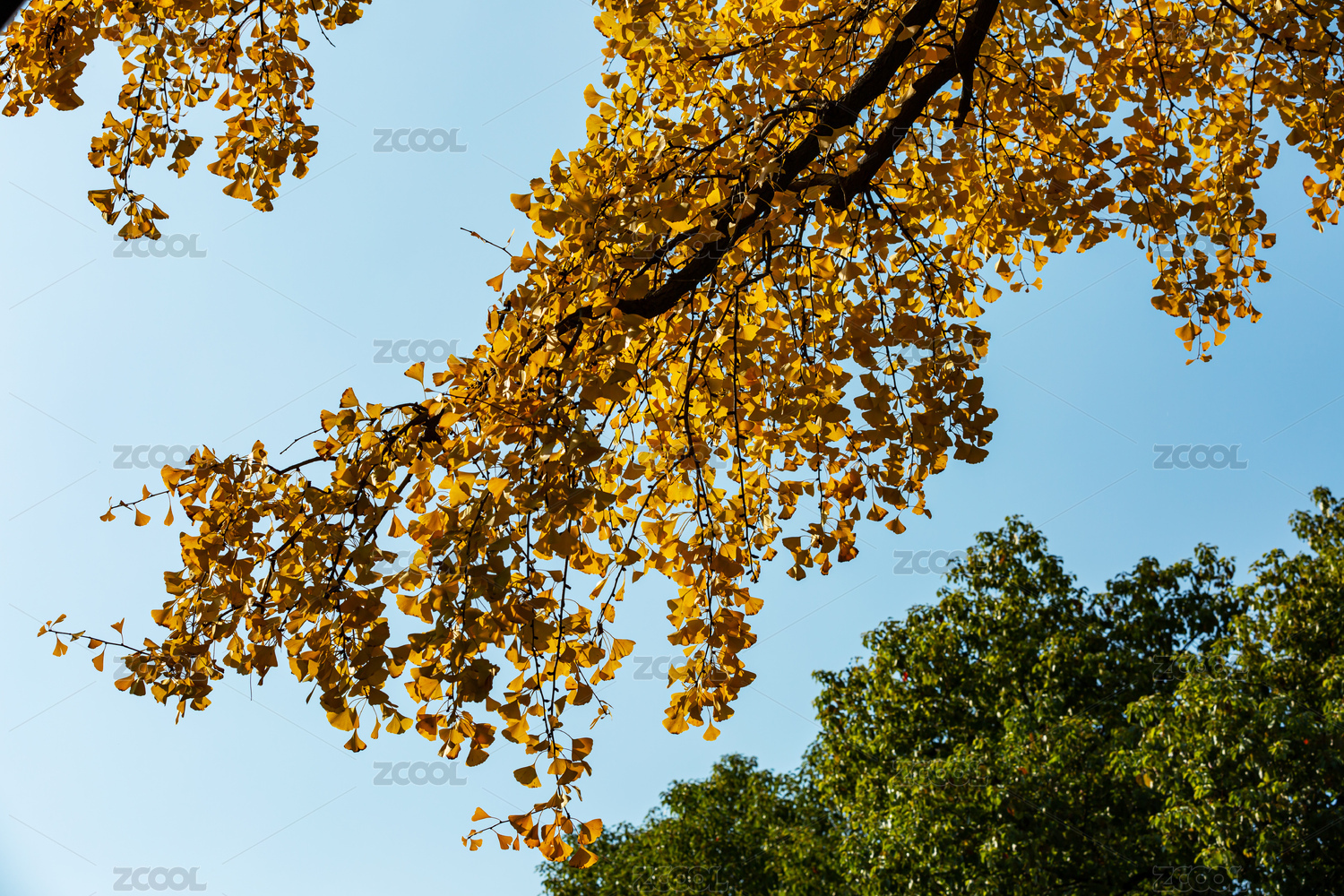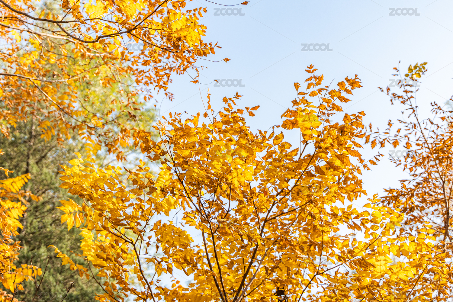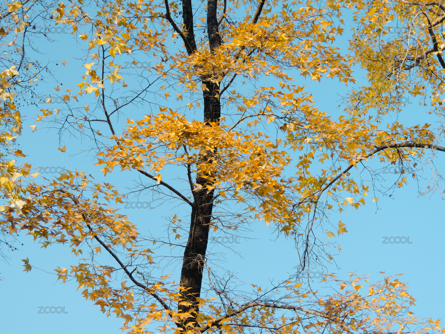 冬天里晴天的枫叶与黄色叶子秋意浓浓