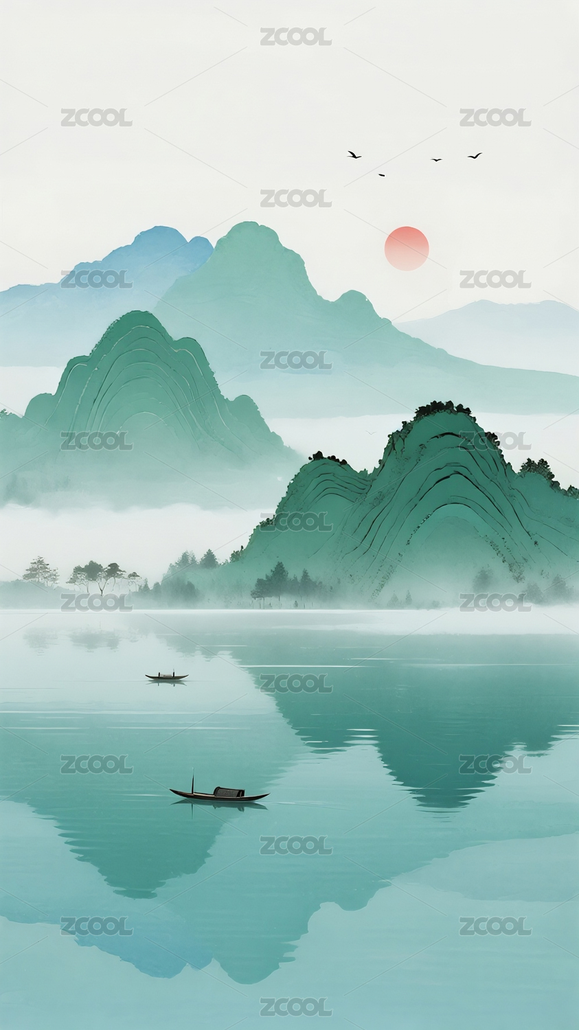 小船高山青松日出飞鸟的水墨画