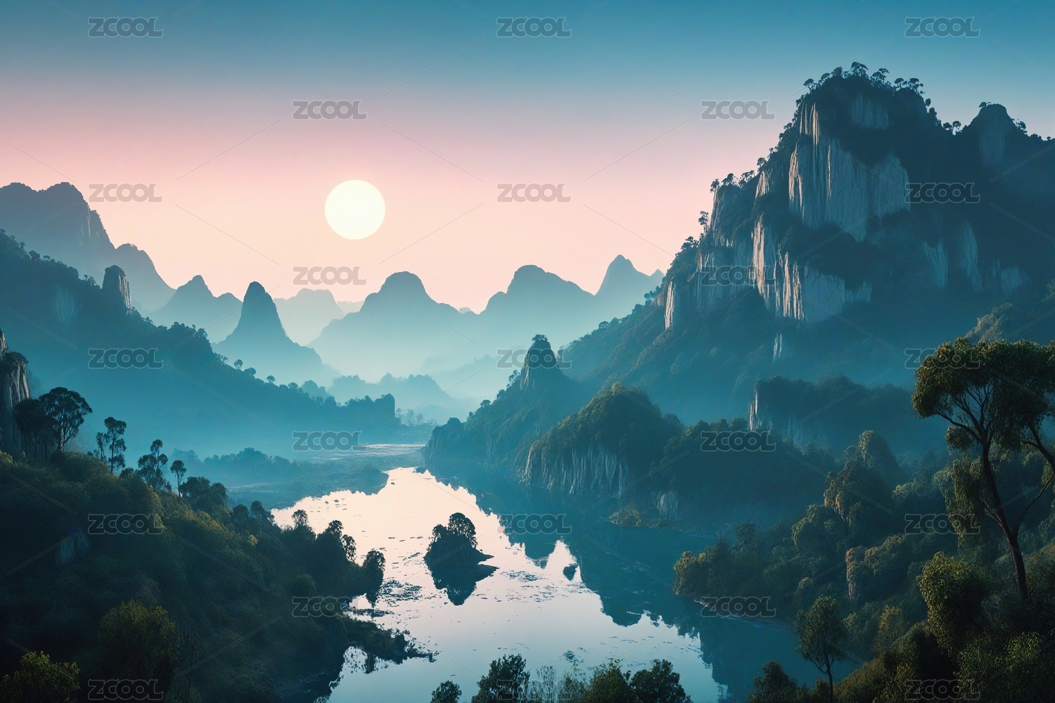 中式水墨山水群山日出插画图