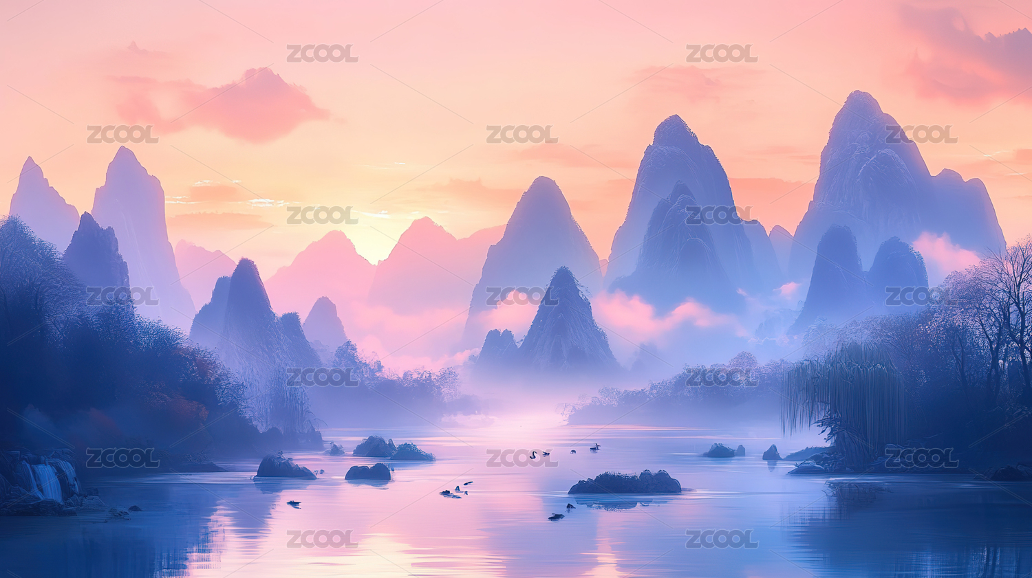 粉色樱花山脉意境景色