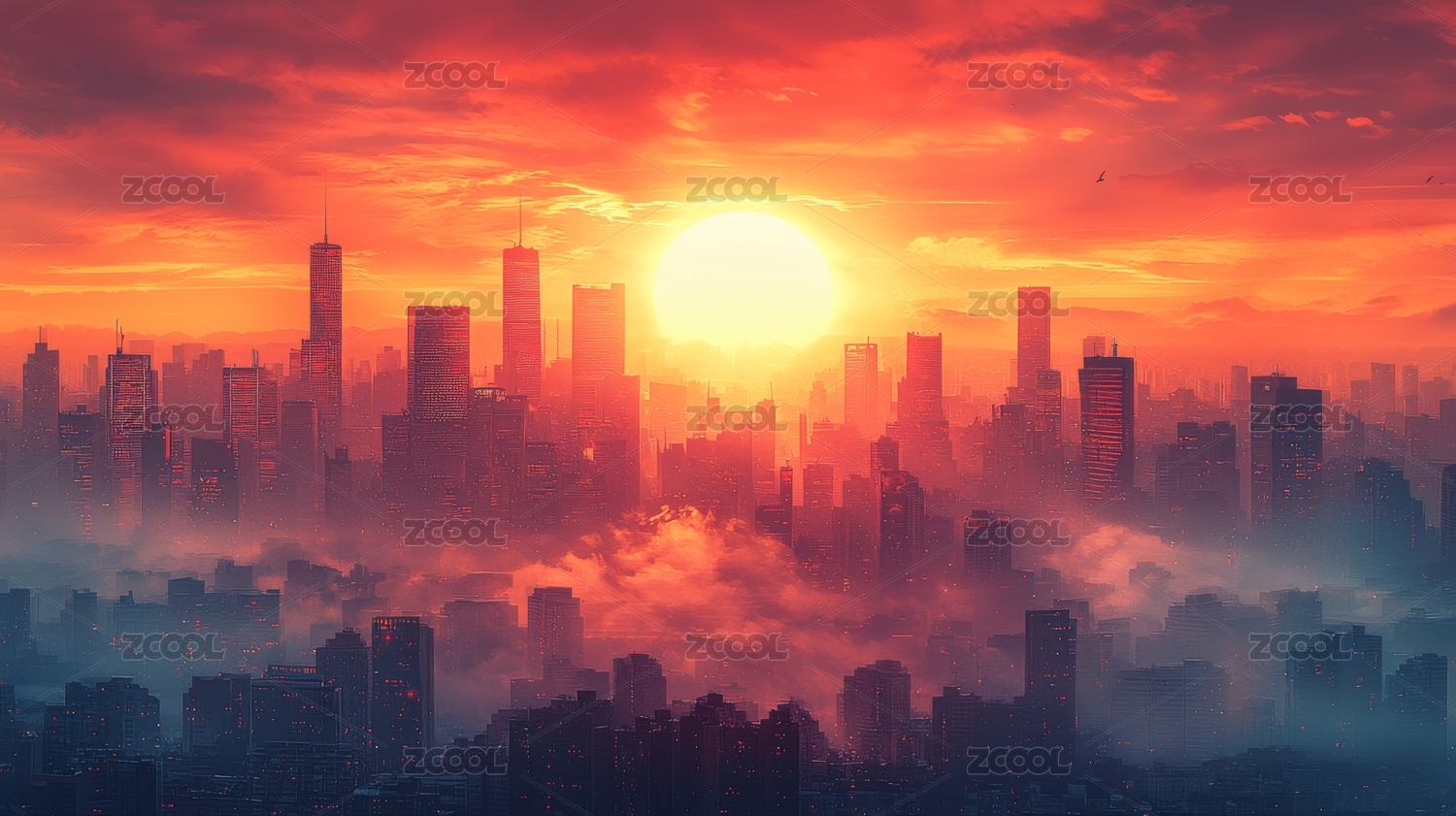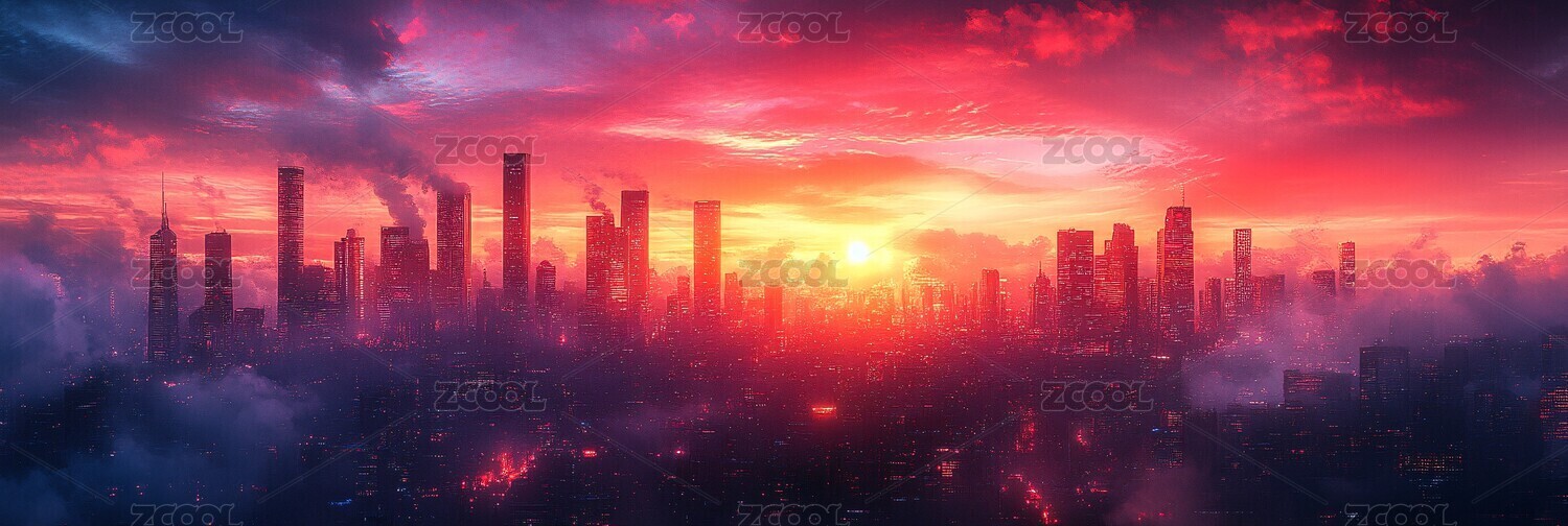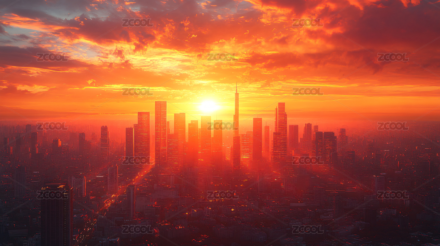 红色日出映衬未来城市天际线