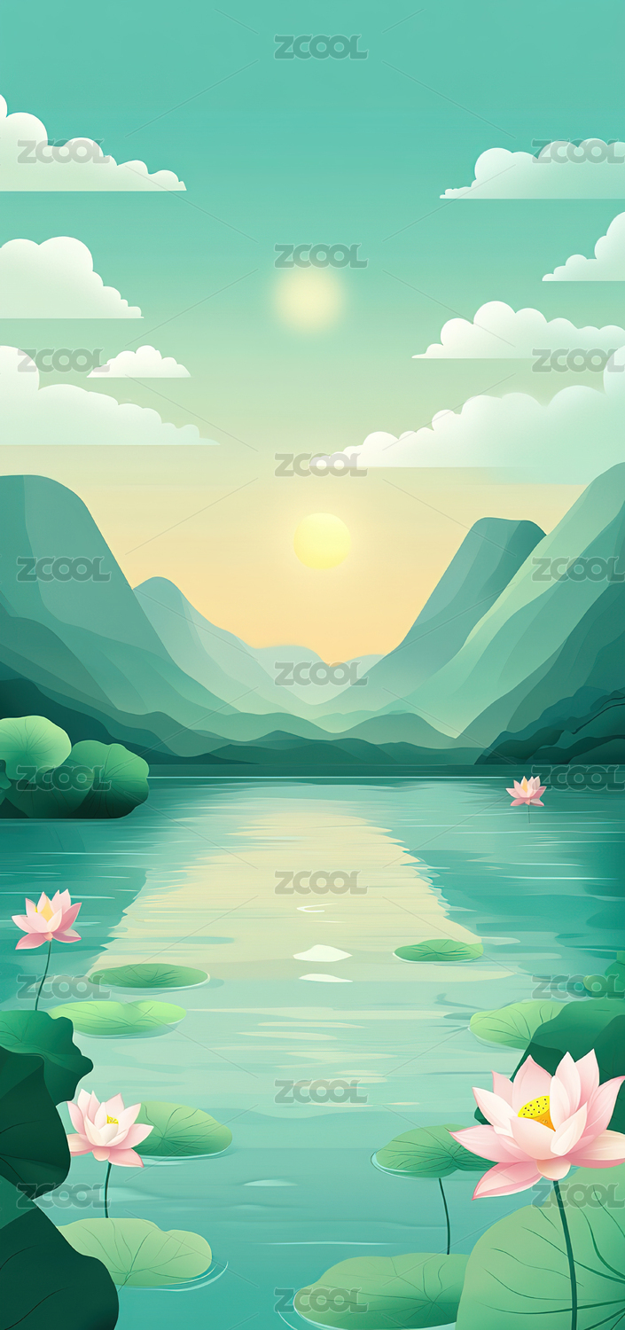 夏天荷花山水矢量背景