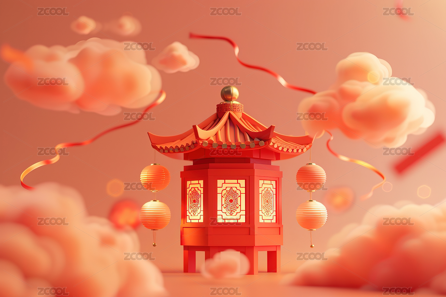 剪纸风中国古建筑红色背景新年春节喜庆庆祝