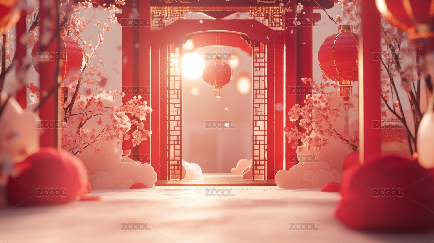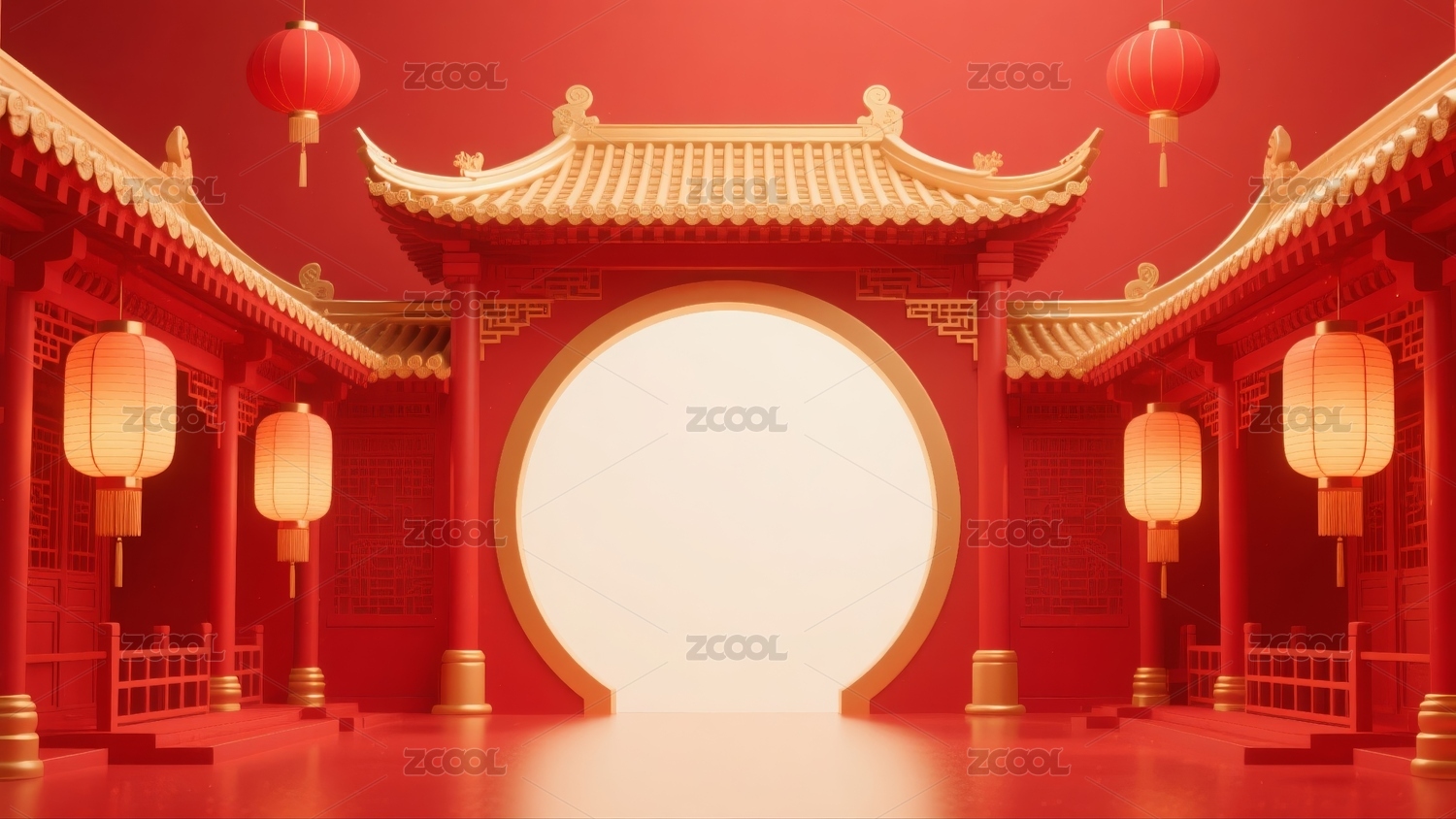 国风国潮新中式节日挂灯笼的中国红古典大门