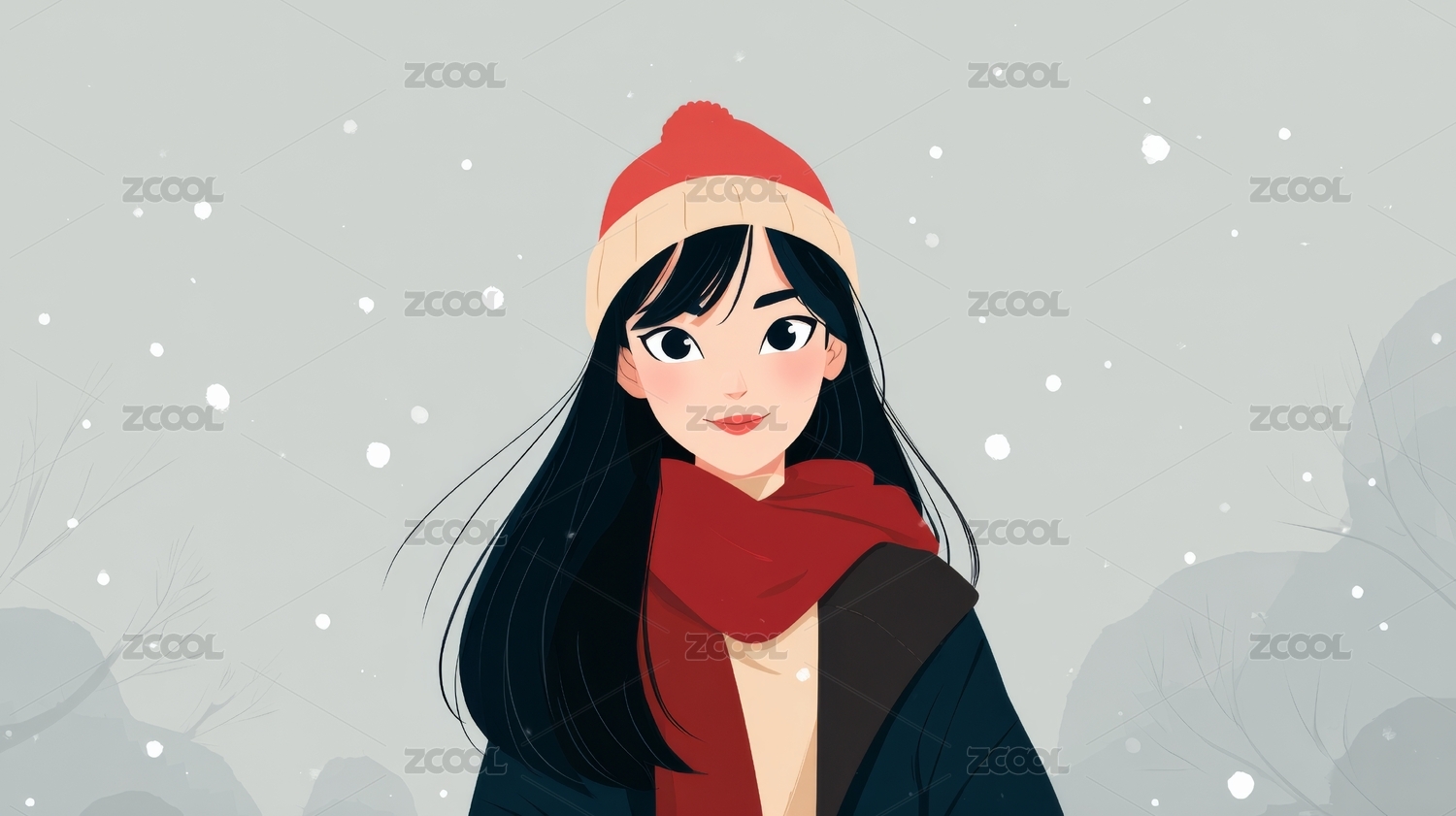 插画,艺术,绘画,阳光,清新,动漫风格,女孩,可爱,户外,雪景