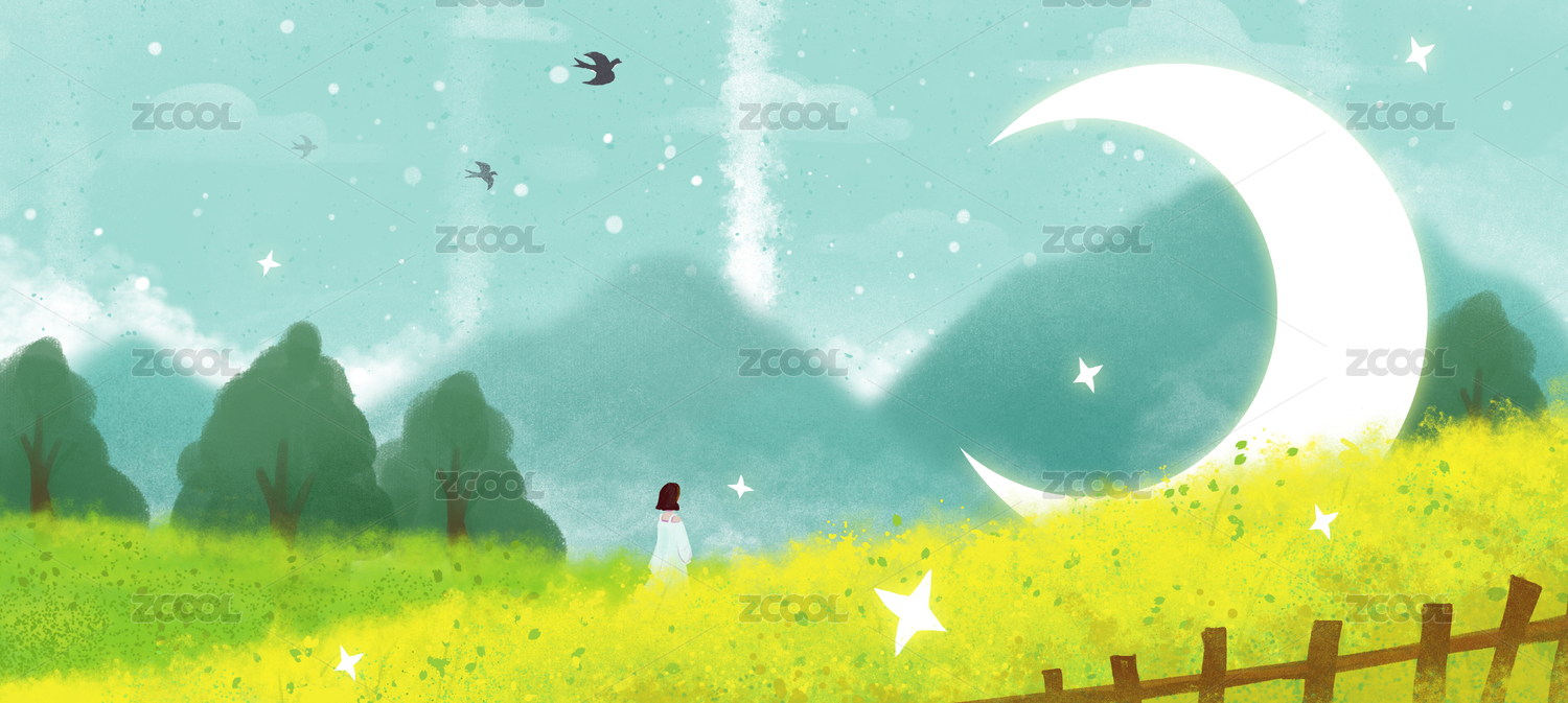 春天里油菜花下拿着鲜花的女孩和月亮长图