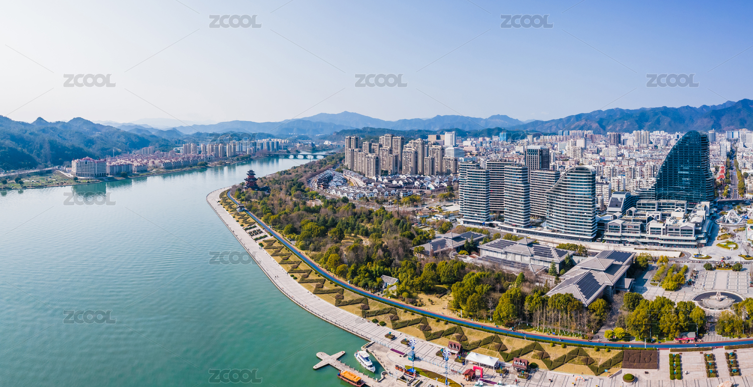 中国浙江省桐庐县富春江两岸城市风光
