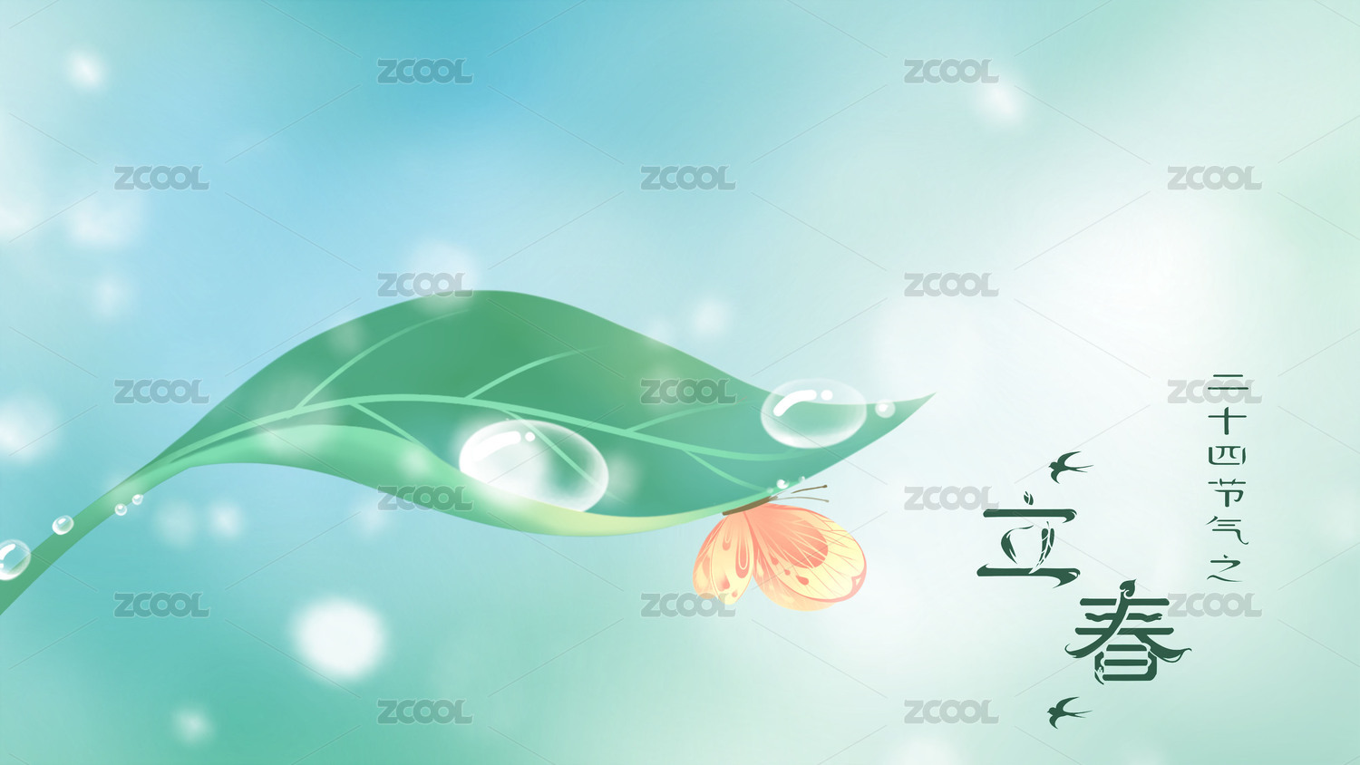 拖着水滴绿叶下躲着一只蝴蝶立春节气插画