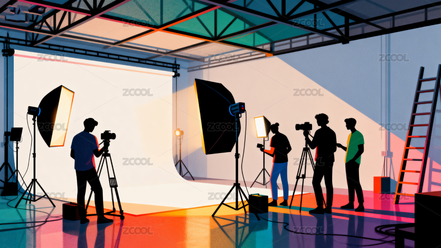 摄影工作室,摄影棚内的工作场景,前景是手机在记录工作场景