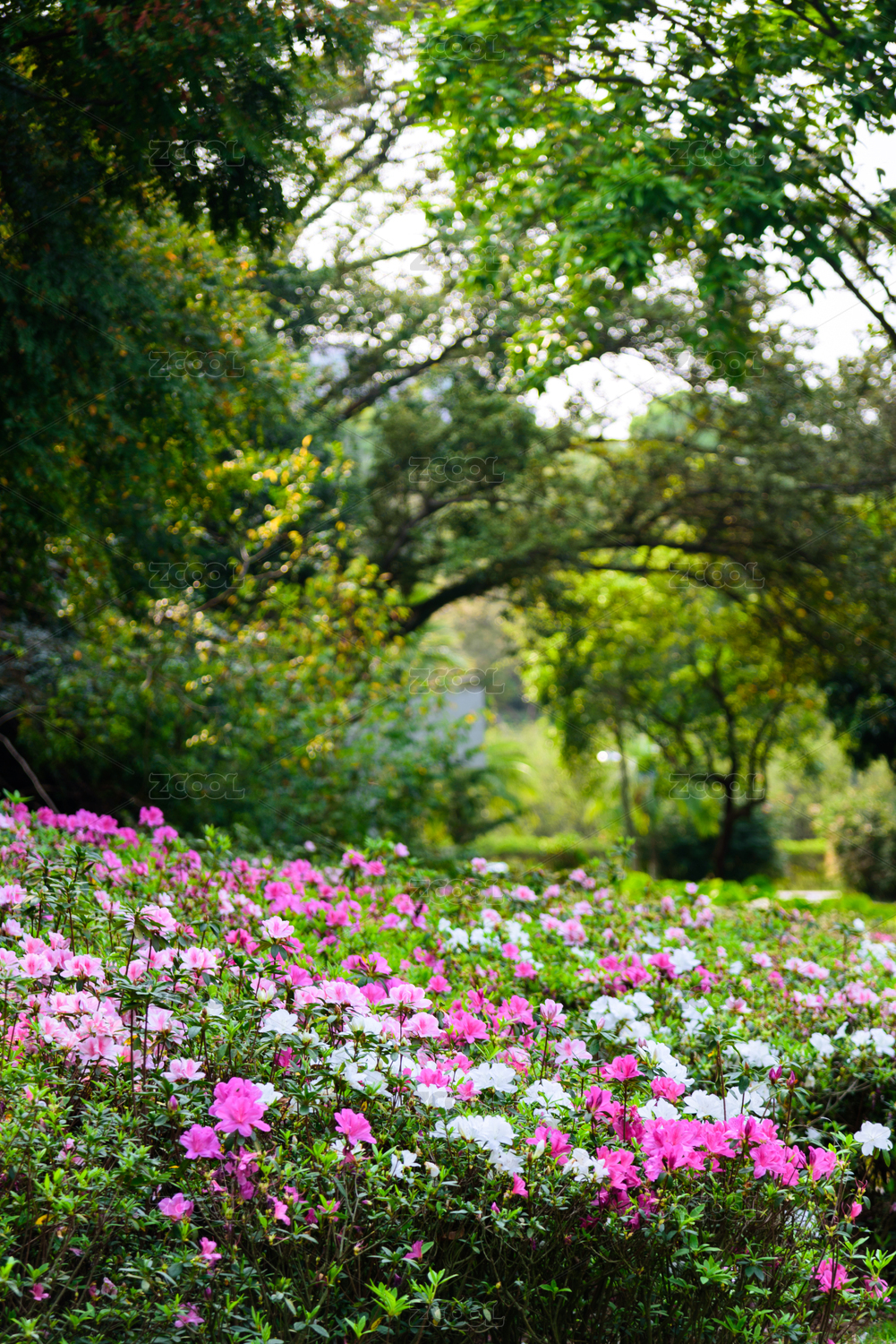 春天公园阳光照耀茂盛的树林和锦秀杜鹃花