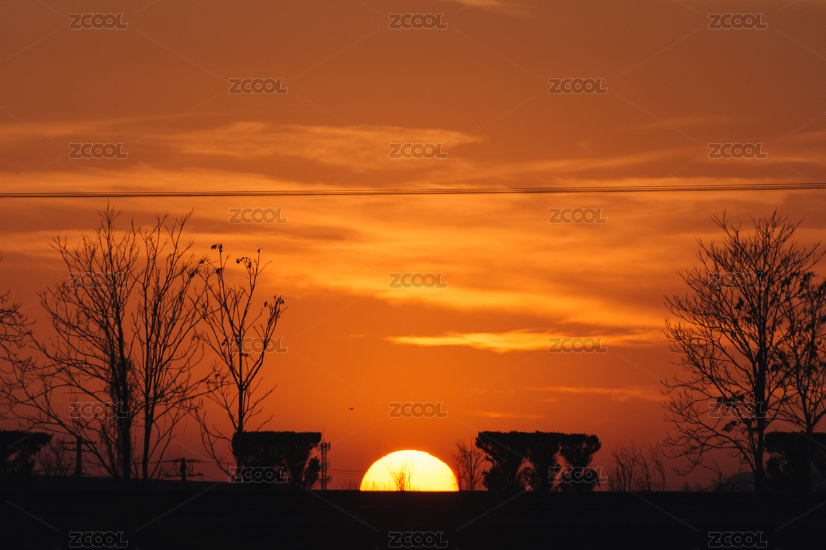 杭州良渚遗址公园夕阳下田野上的树木和天空