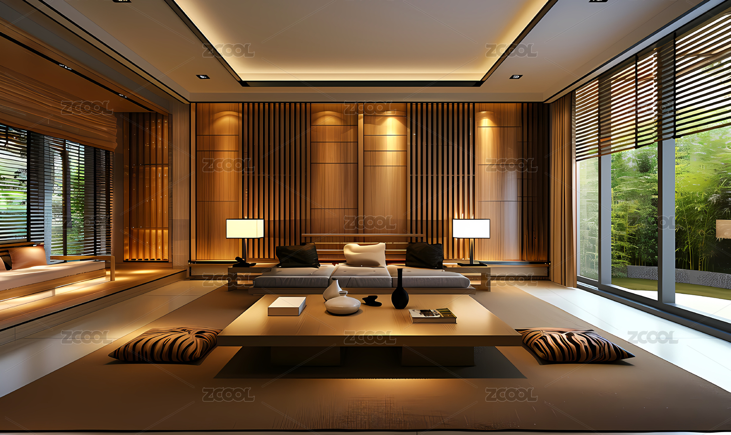 现代卧室室内设计木质墙壁和大窗户俯瞰花园