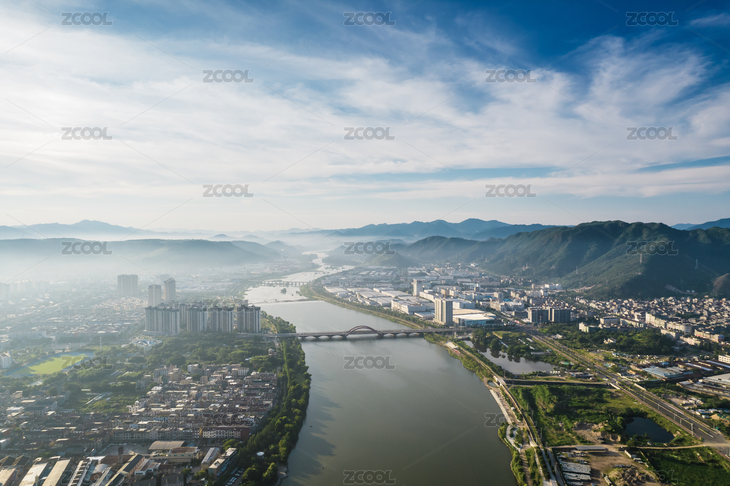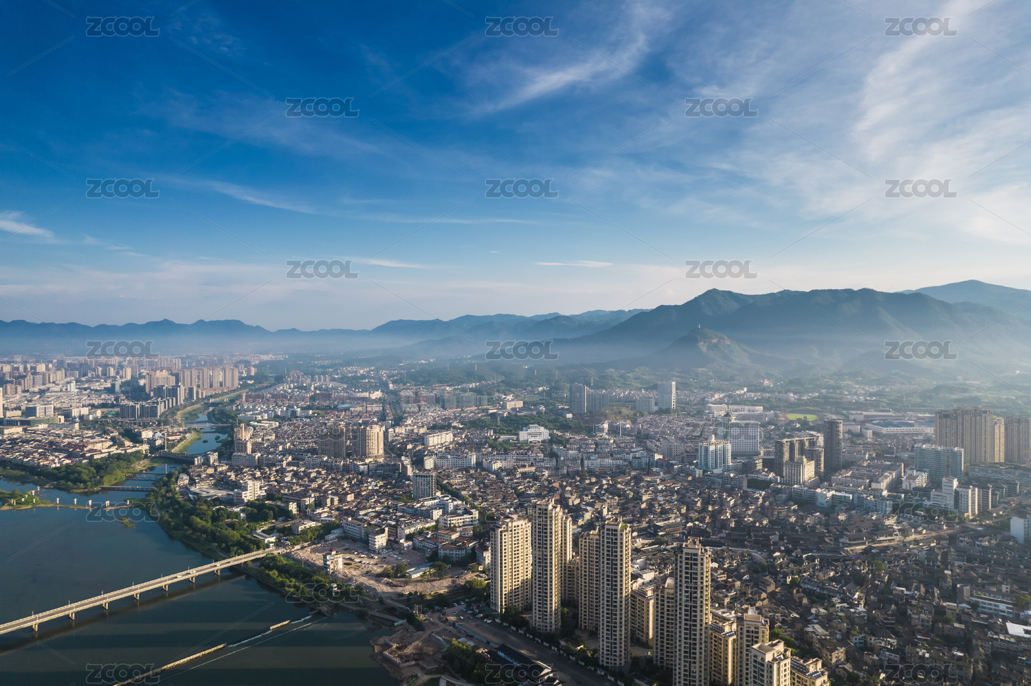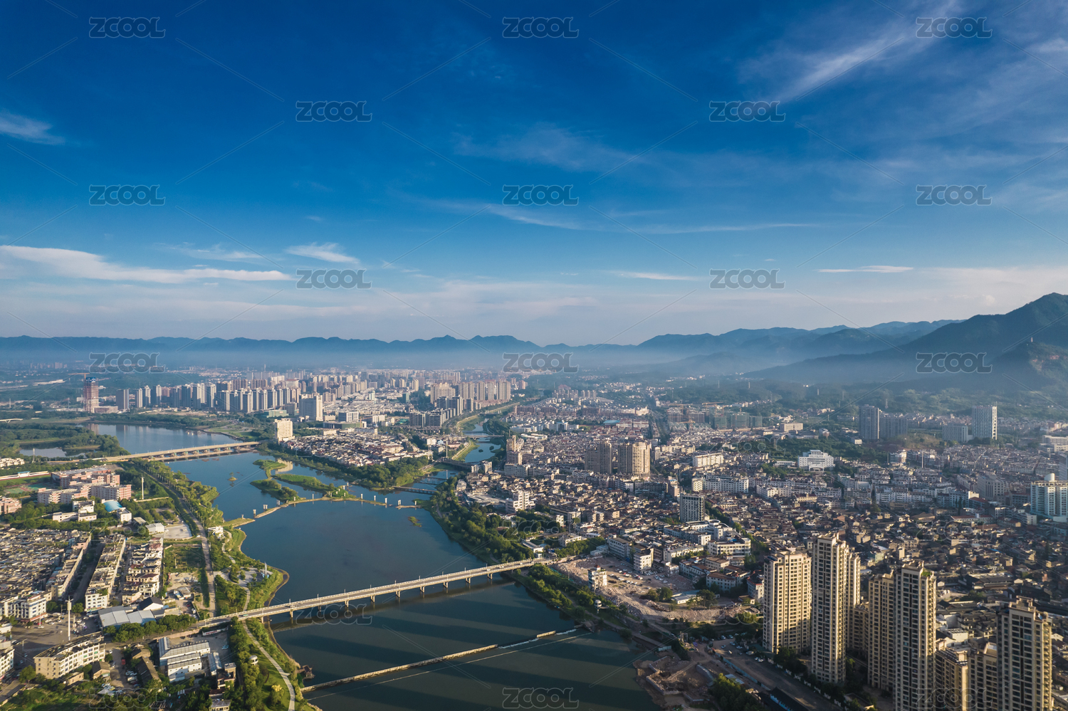 清晨航拍天台县始丰溪两岸城市风光
