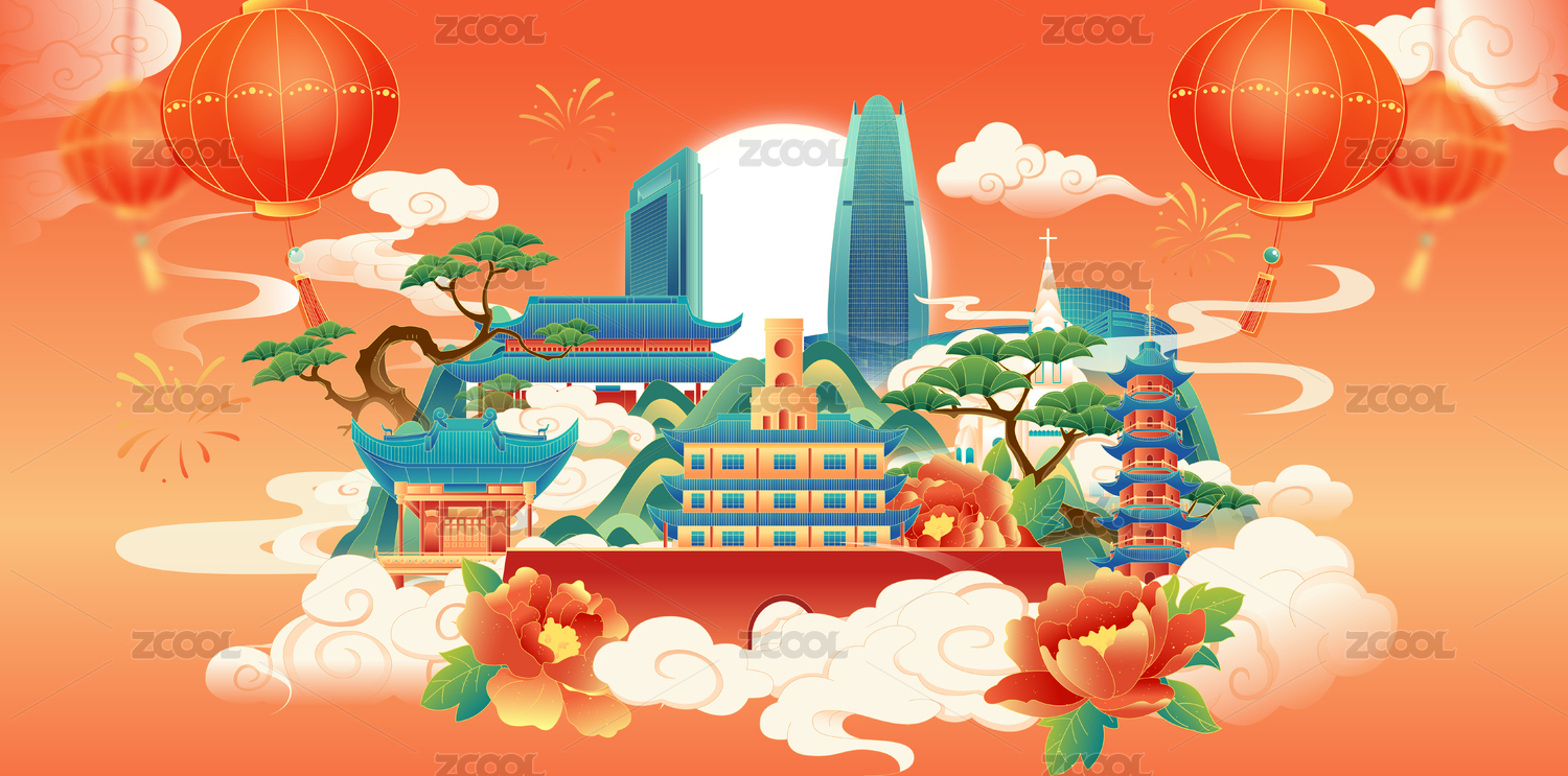 国风蛇年春节新年郑州城市建筑矢量插画