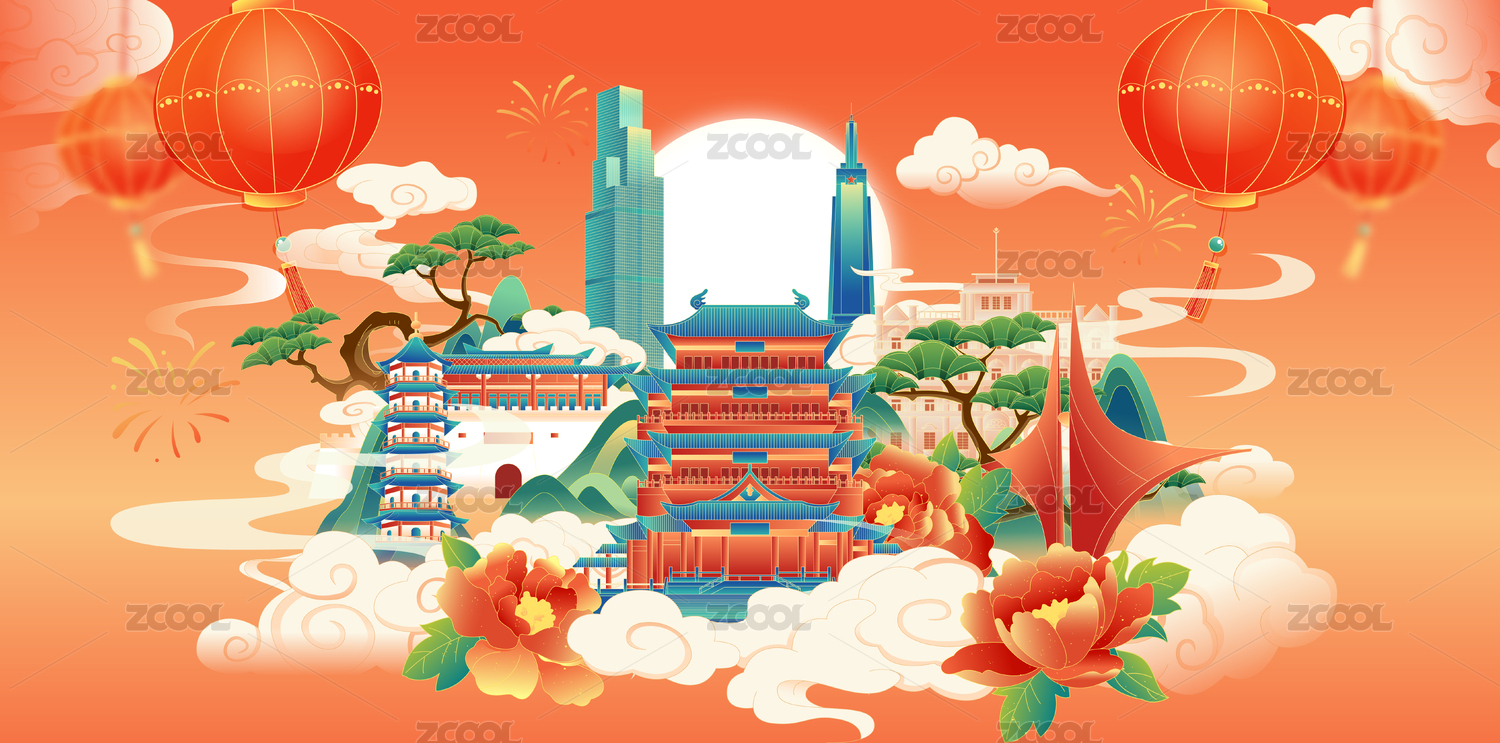 国风蛇年春节新年南京城市建筑矢量插画