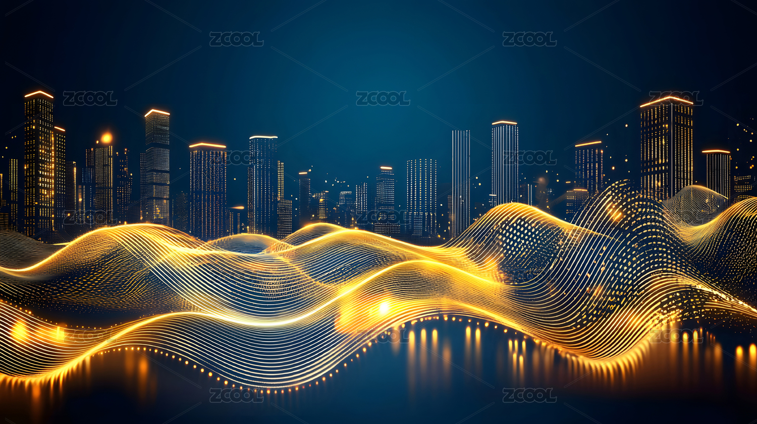 黑金,光效,波浪曲线,城市建筑群,夜晚,未来科技,现代都市感,高科技