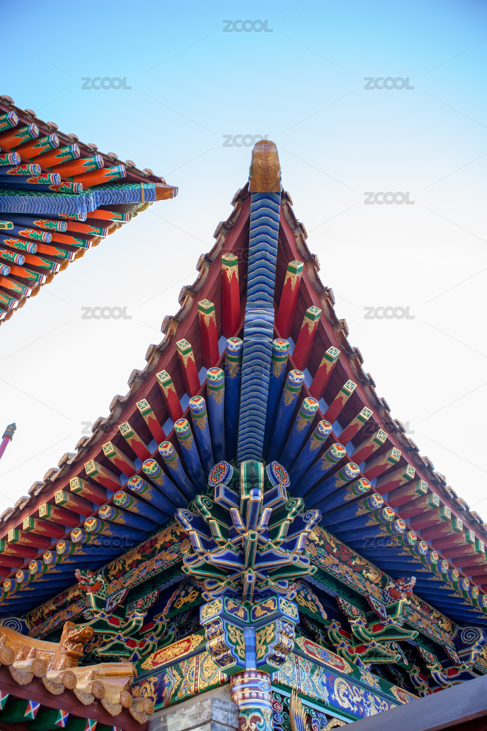 中国北京颐和园皇家古建一角——琉璃瓦瑞兽斗拱彩绘描金