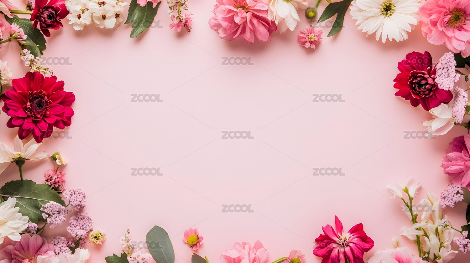 粉色背景上多彩鲜花组成花框