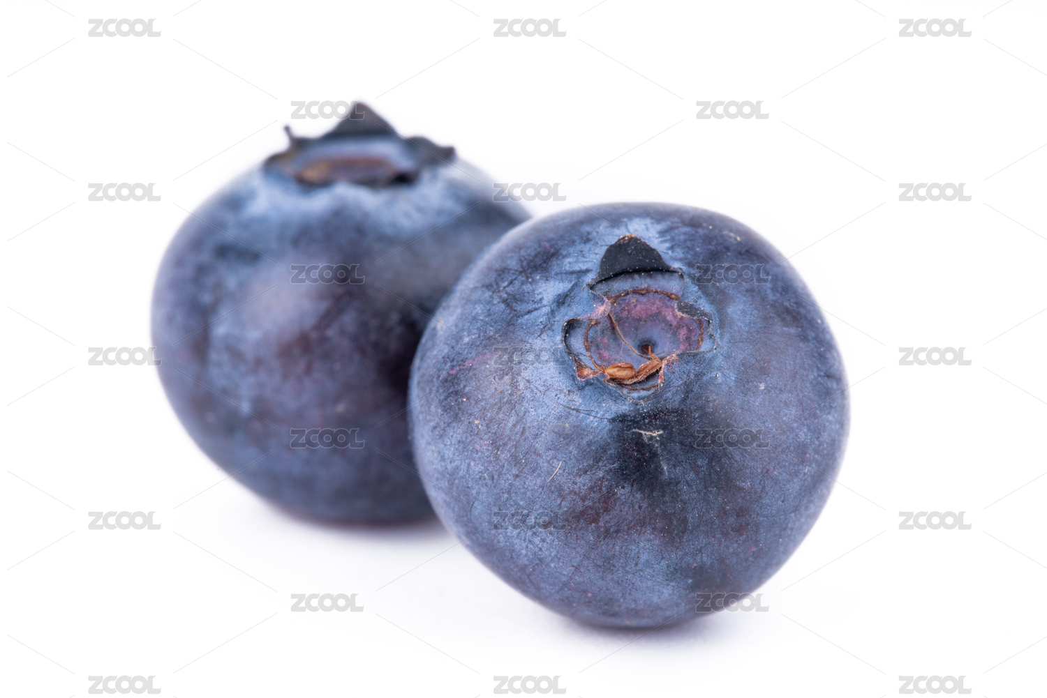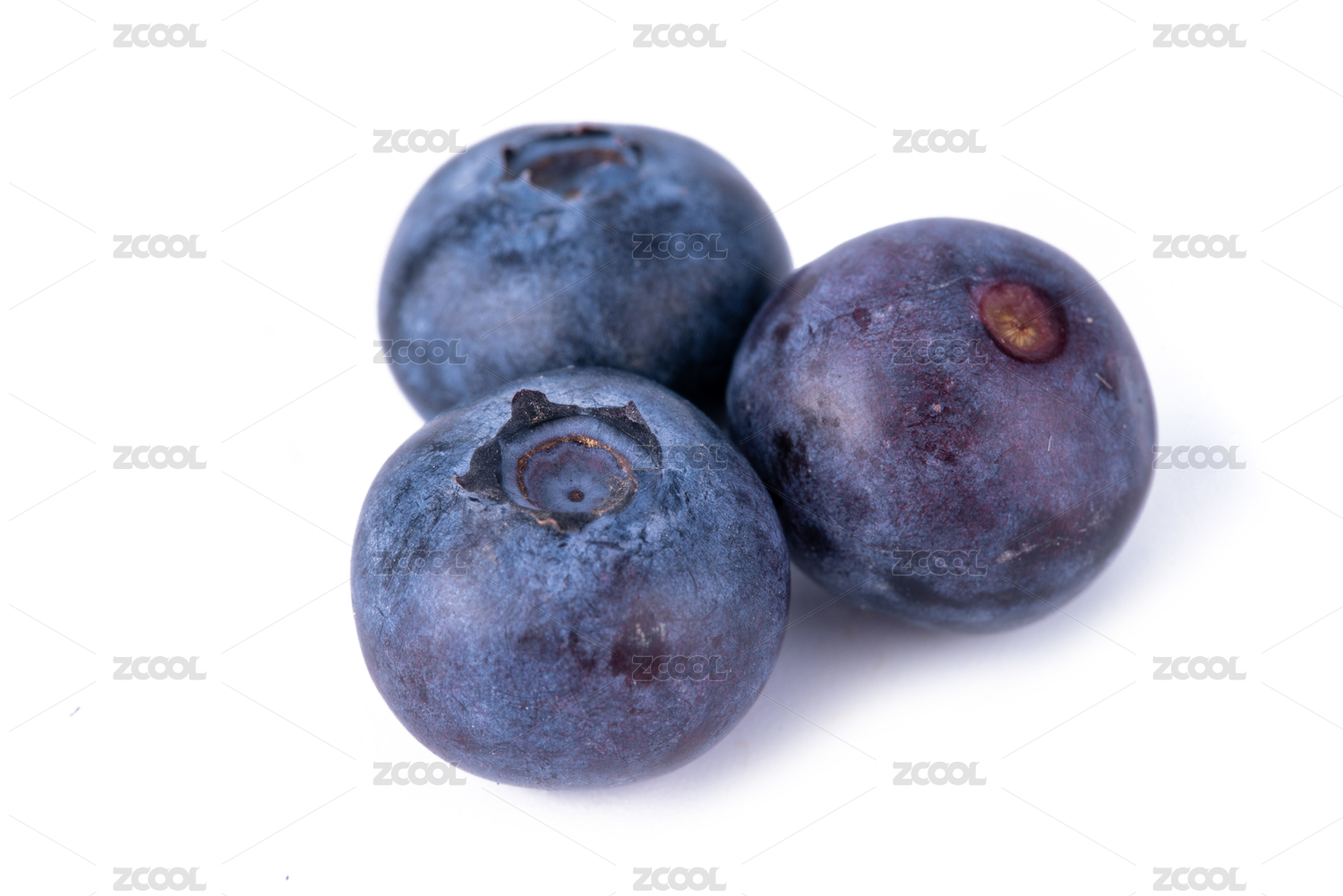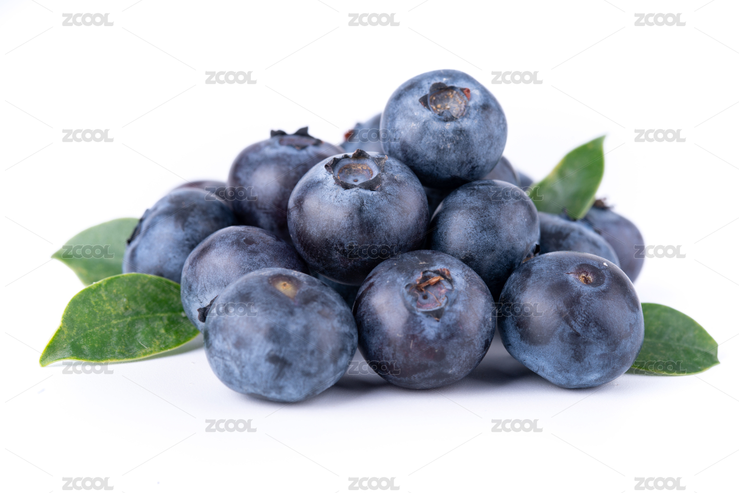 白底上一堆带叶子的蓝莓和半个切开的蓝莓