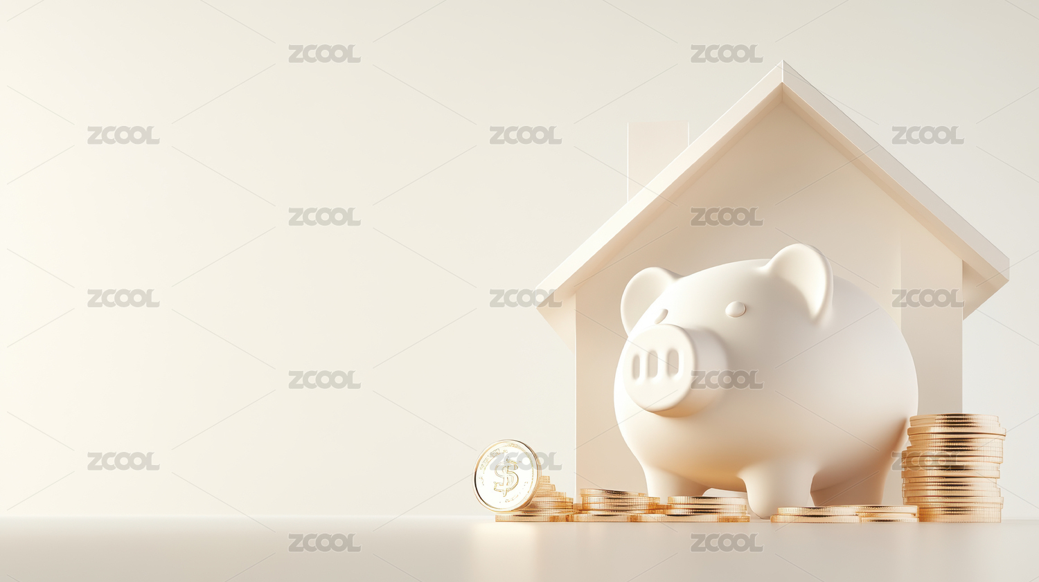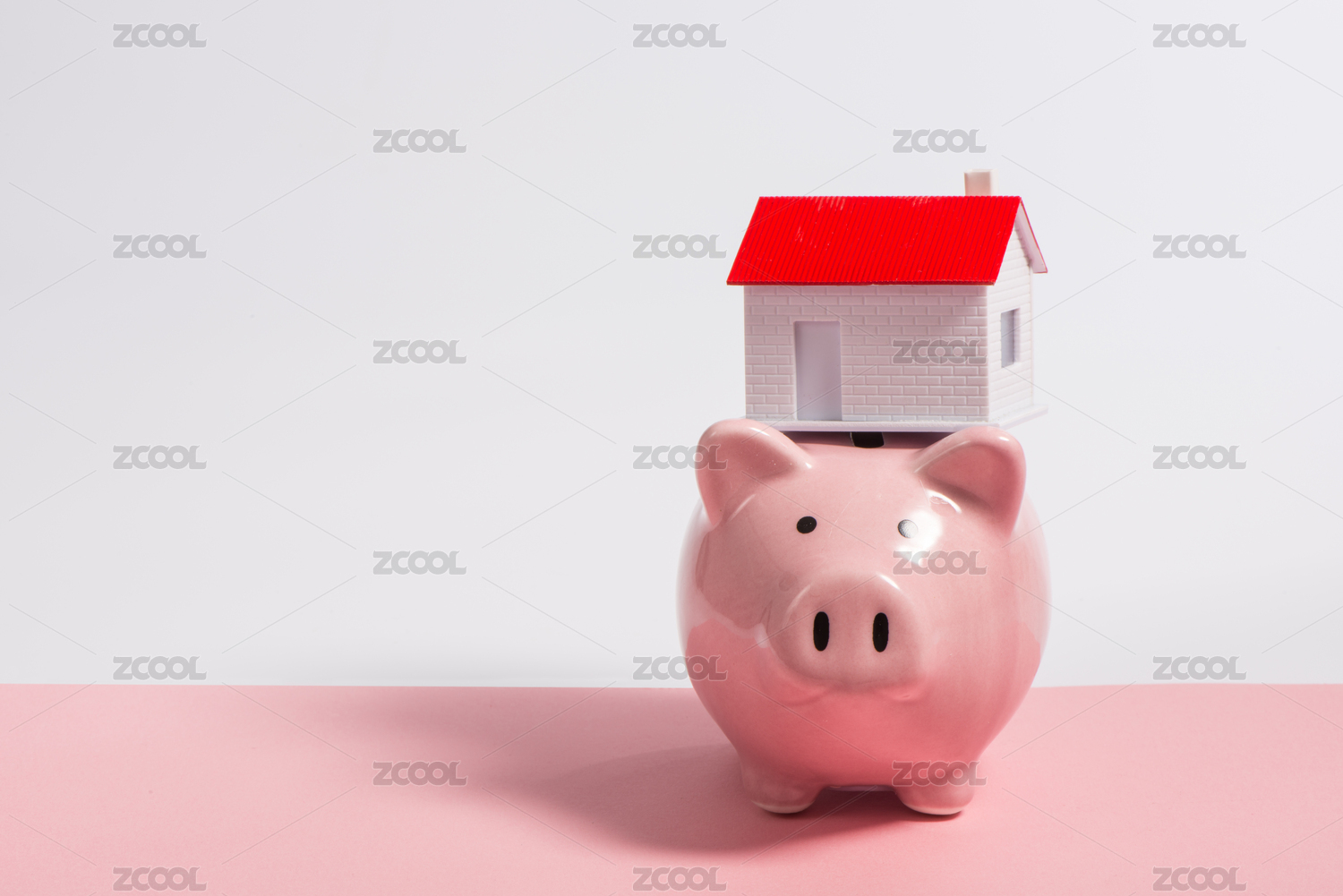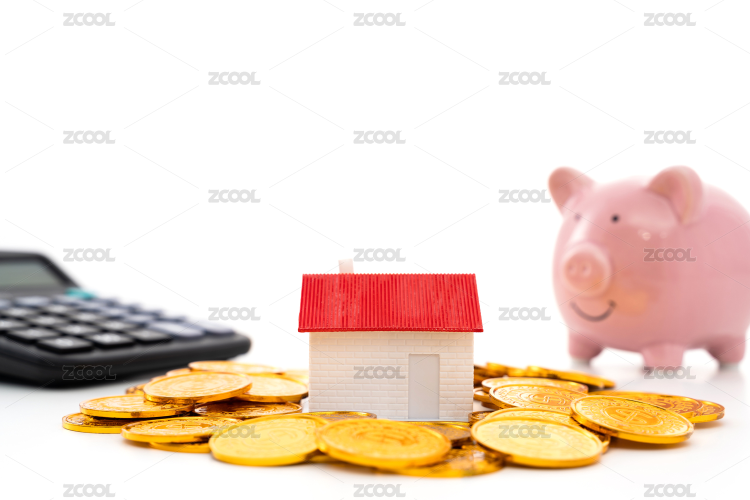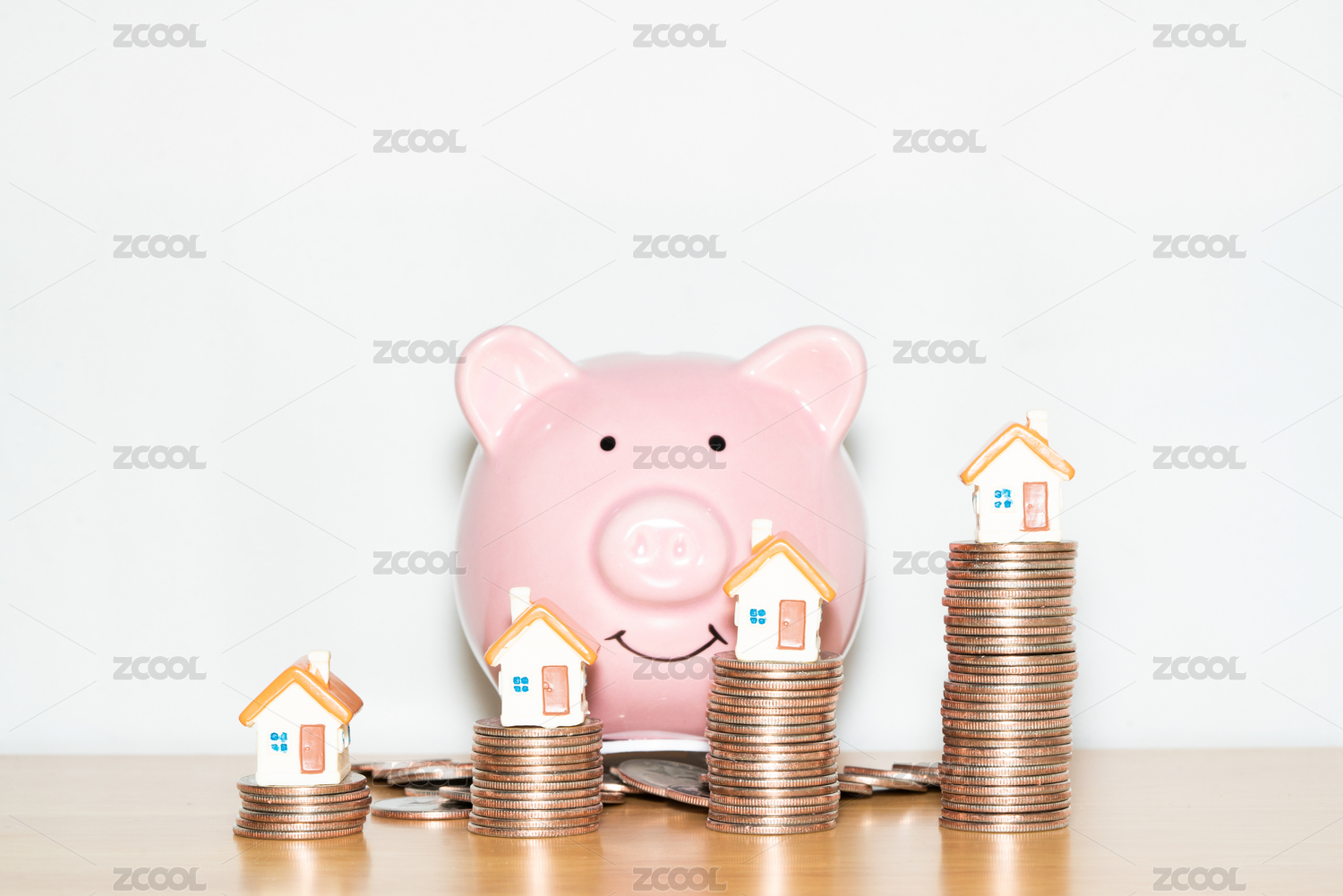 小猪存钱罐和硬币货币堆砌起来小房子置业买房房贷房价行情房地产概念