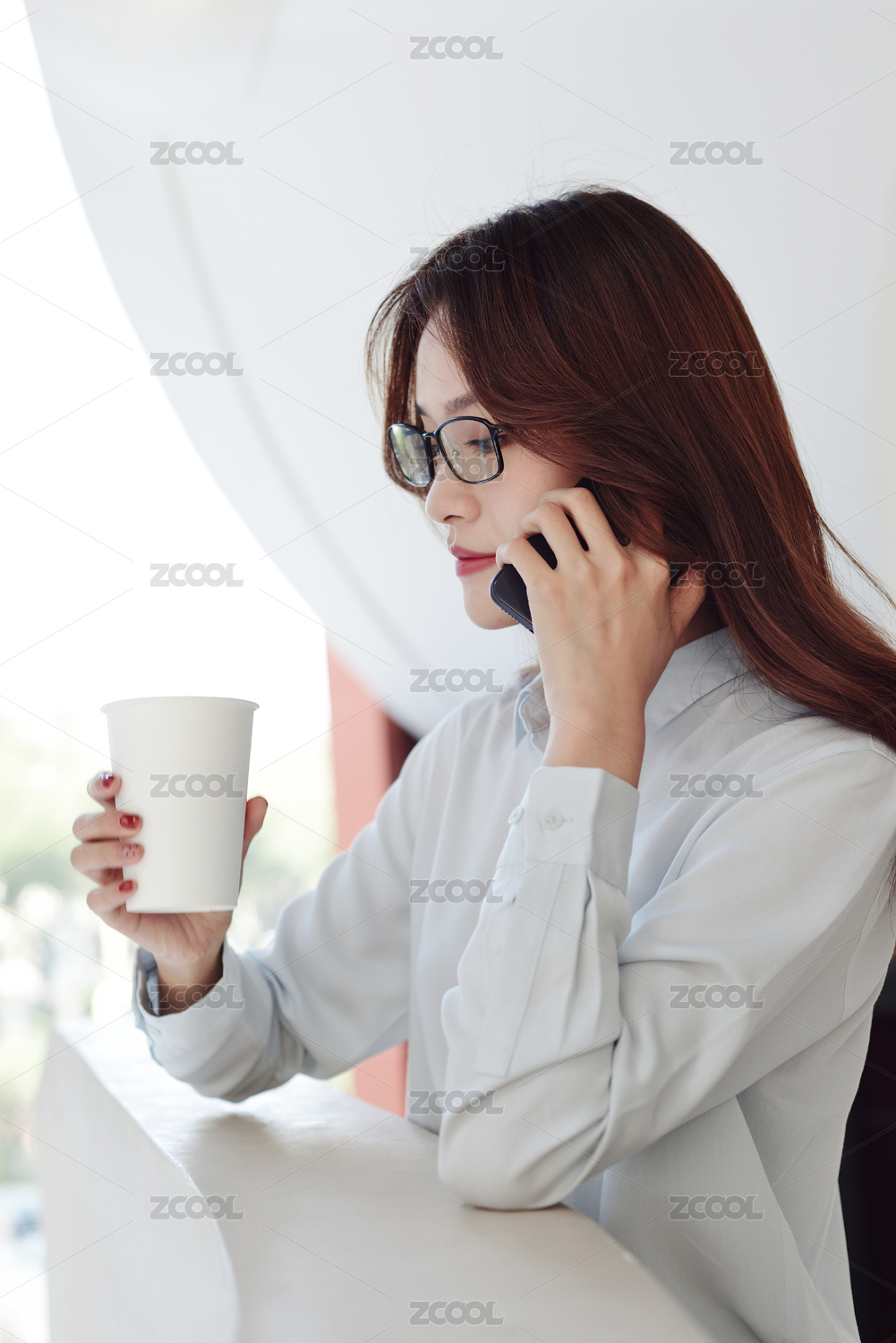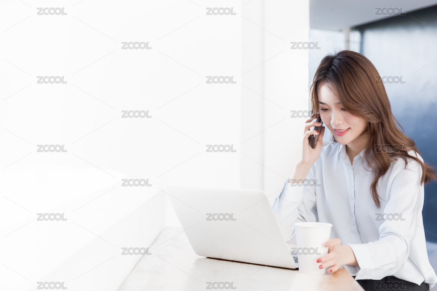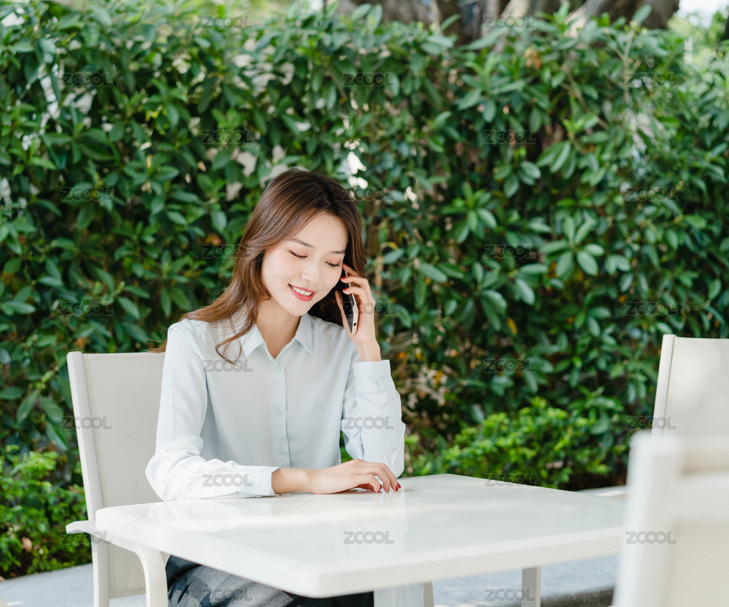 一个中国女白领坐在咖啡厅的桌子边用手机打电话