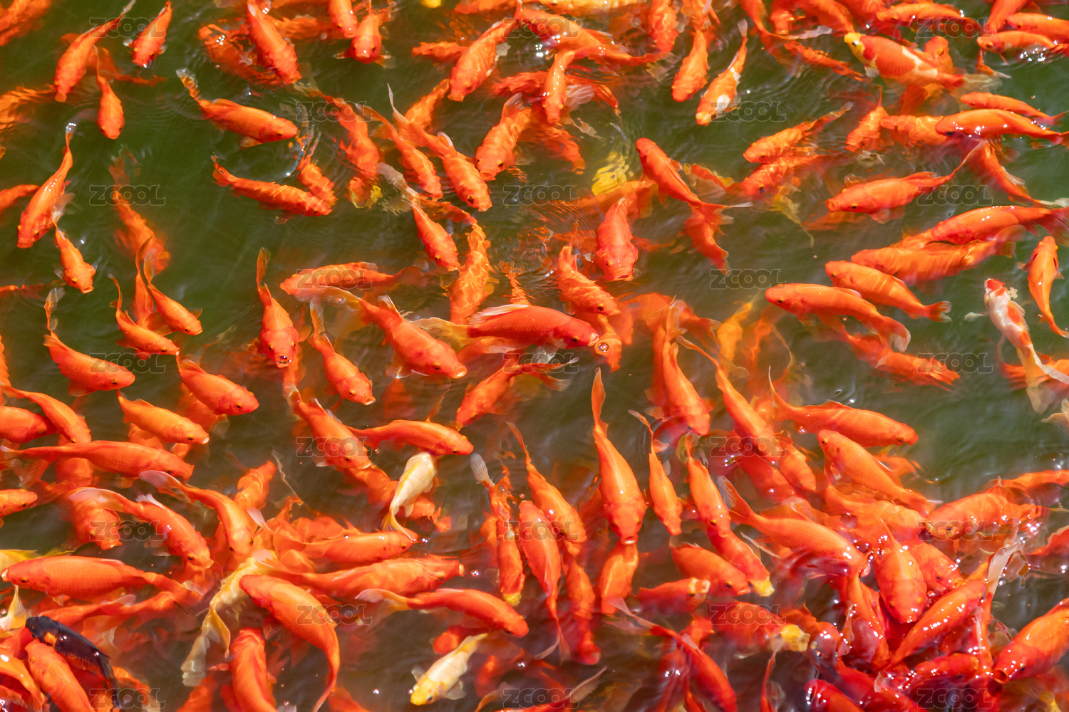 夏天锦鲤和金鱼在鱼池里欢快的游动