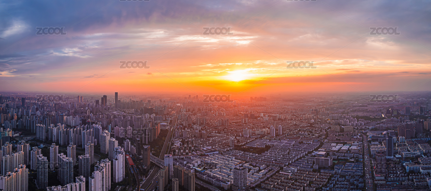 中国沈阳青年大街CBD全景航拍夕阳晚霞