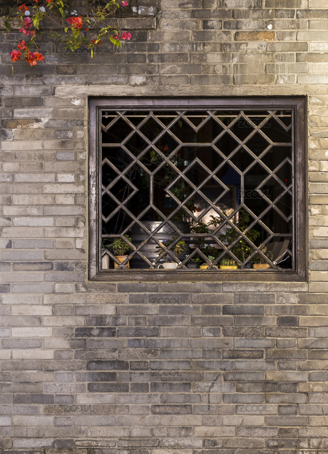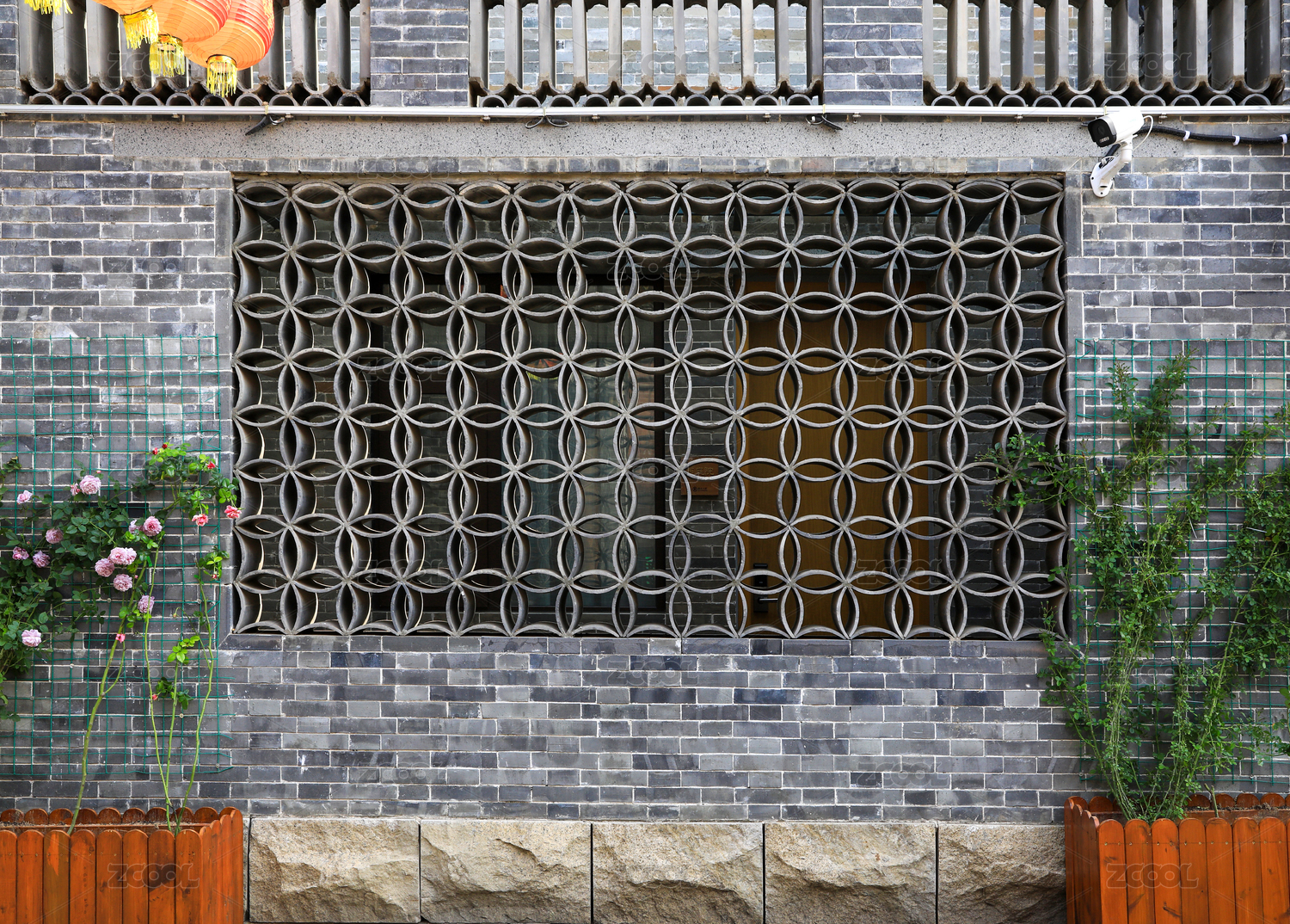 深圳洪湖公园中式园林墙面青石砖墙与窗格