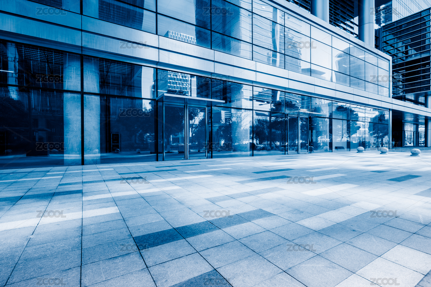 办公楼内部,蓝色色调的图像。