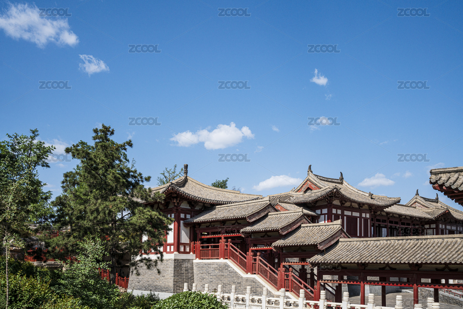 蓝天白云下的中国山西北岳恒山寺庙前的古松树