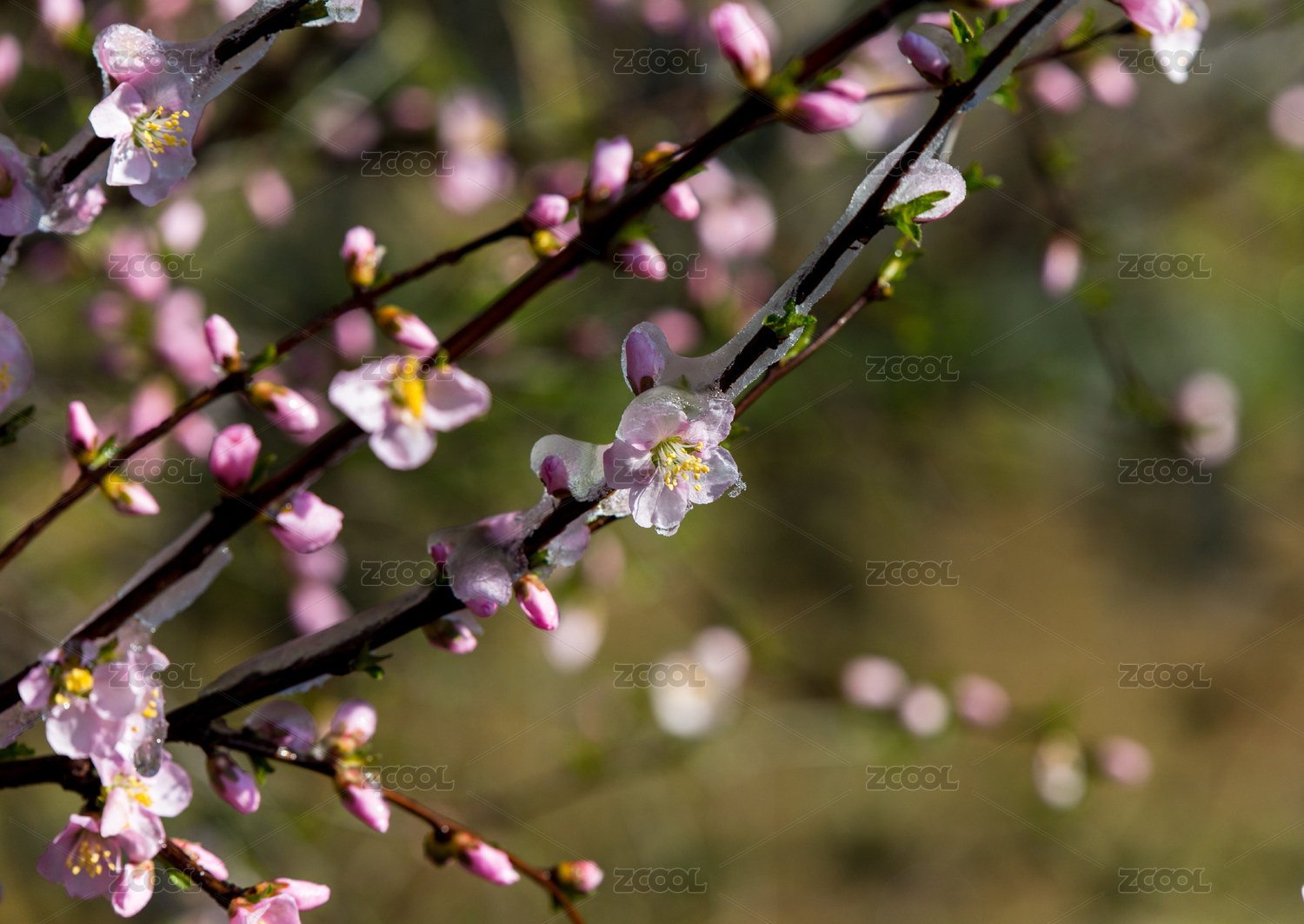 春天里寒潮来临下被冰冻的梅花