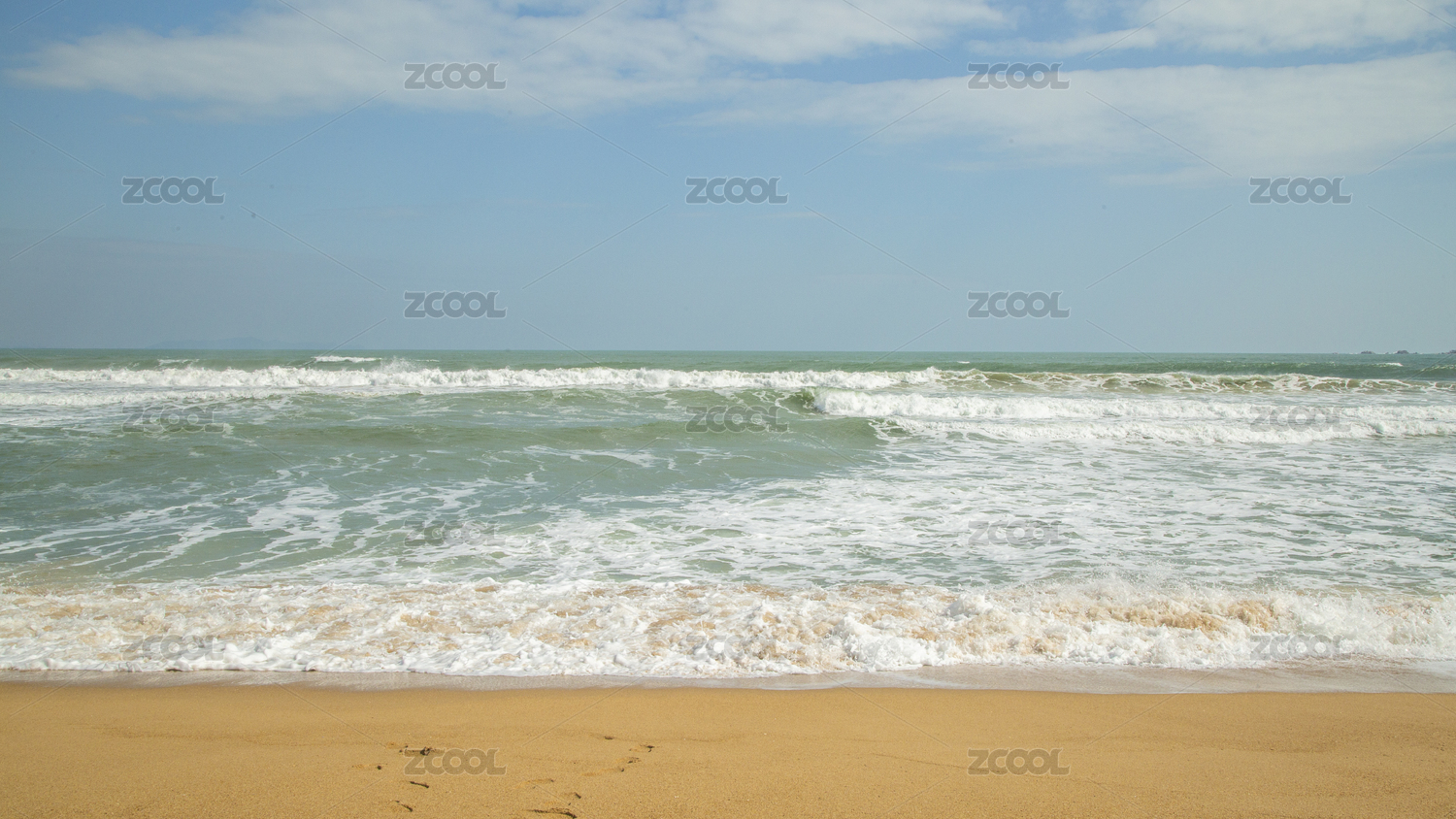 正面拍摄金色沙滩以及蓝色的海水、白色的波浪