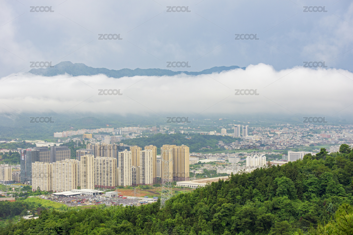 山腰的云雾及山谷中的城市建筑,福建龙岩