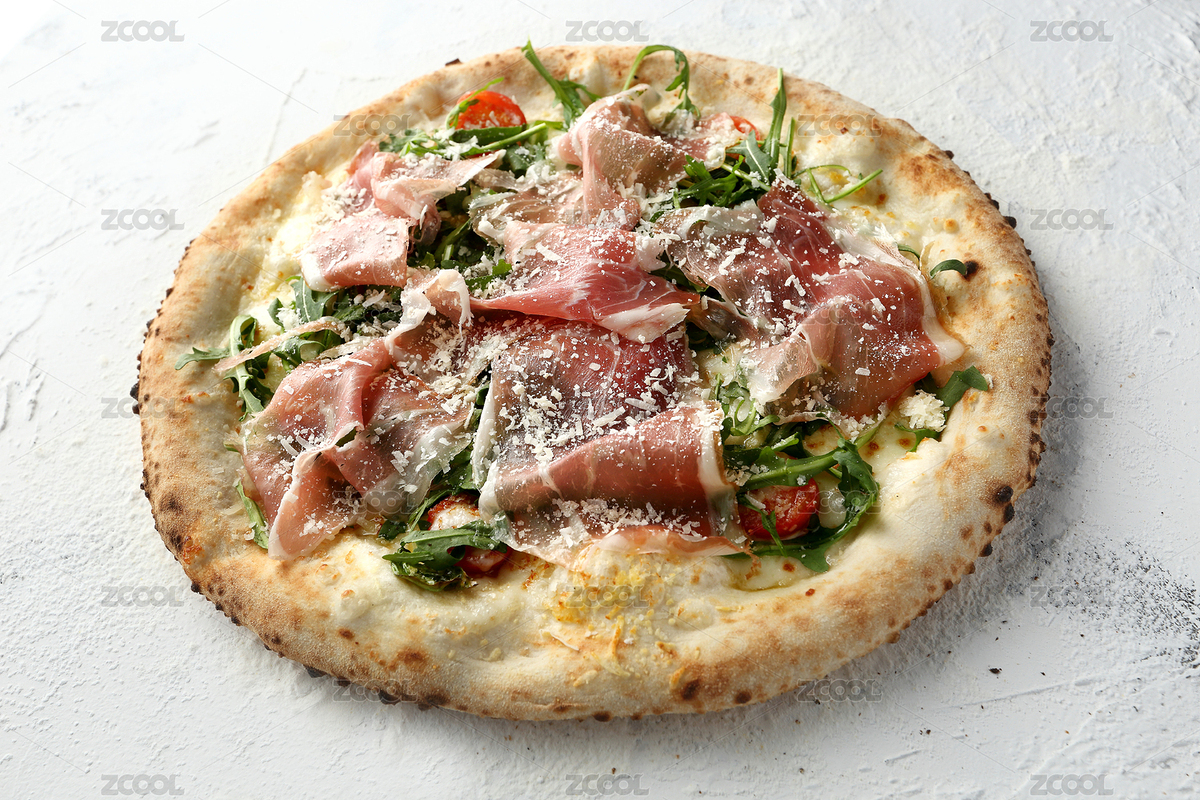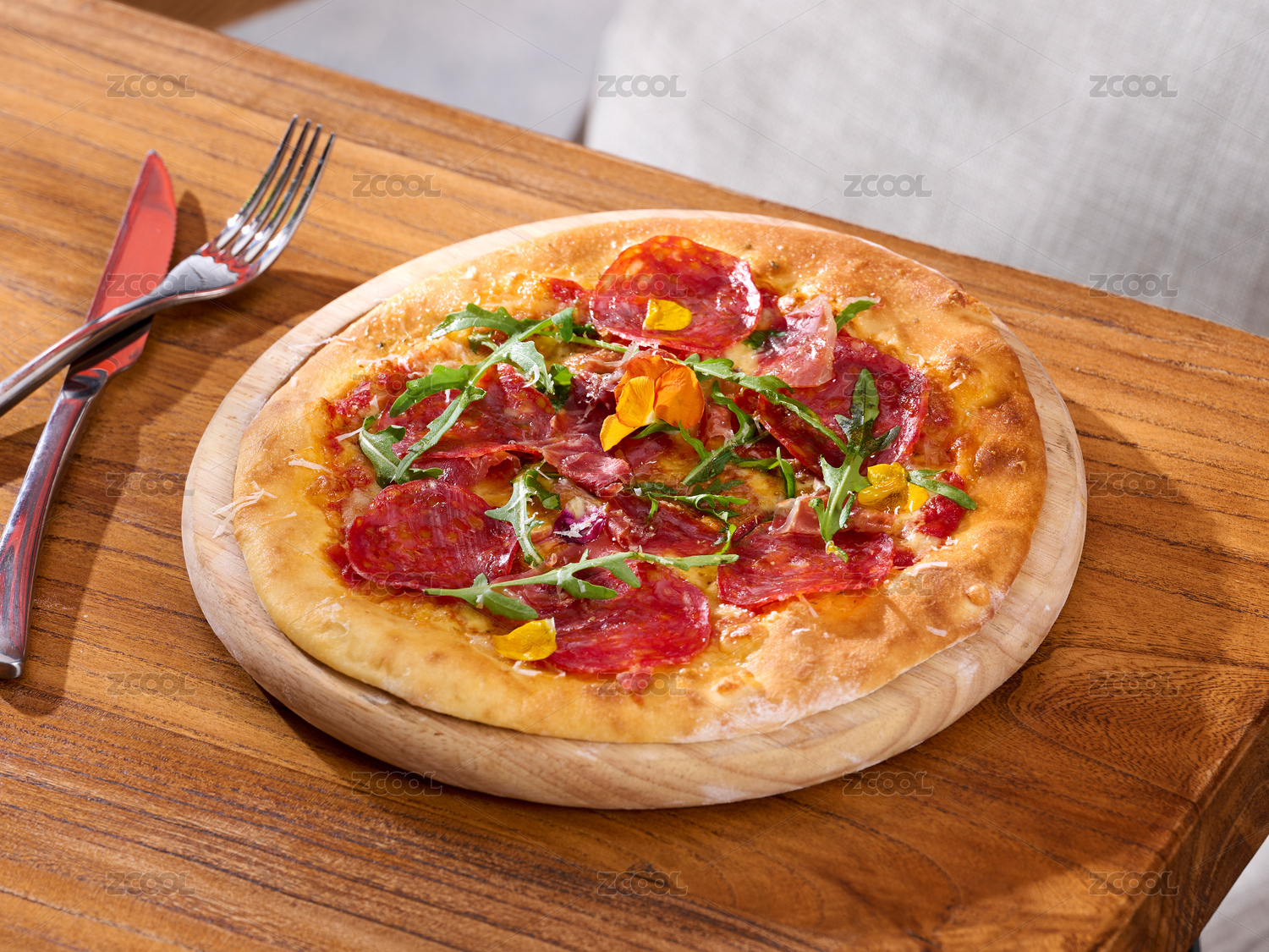 木色桌面上侧逆光硬光拍摄暖色调披萨摄影