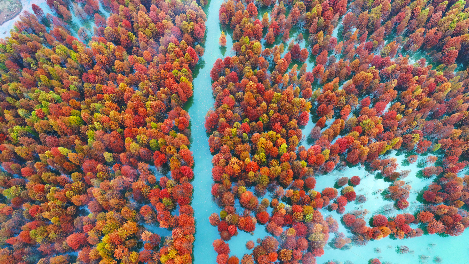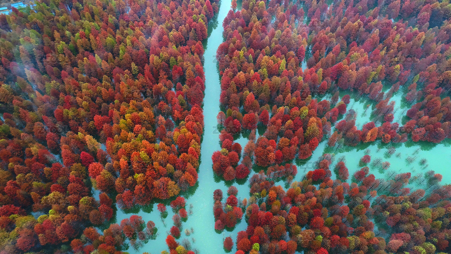 航拍中国安徽宣城宁国方塘乡红杉林湿地公园