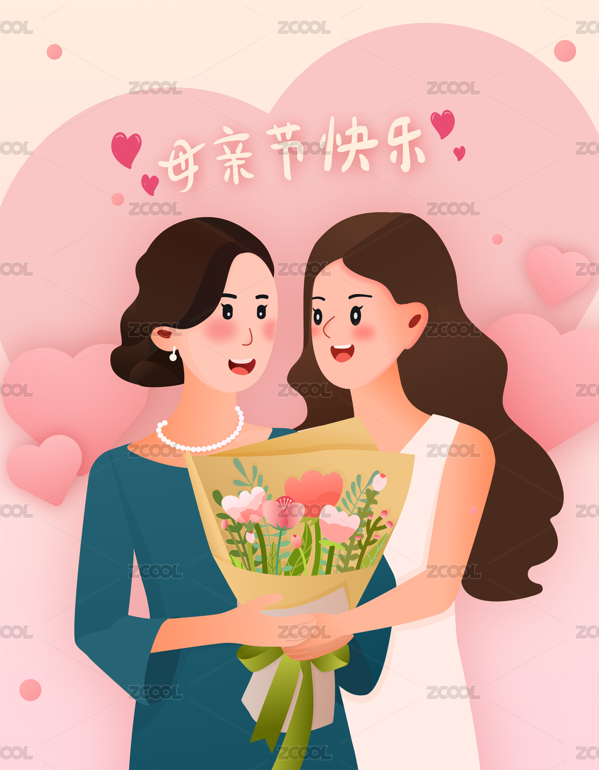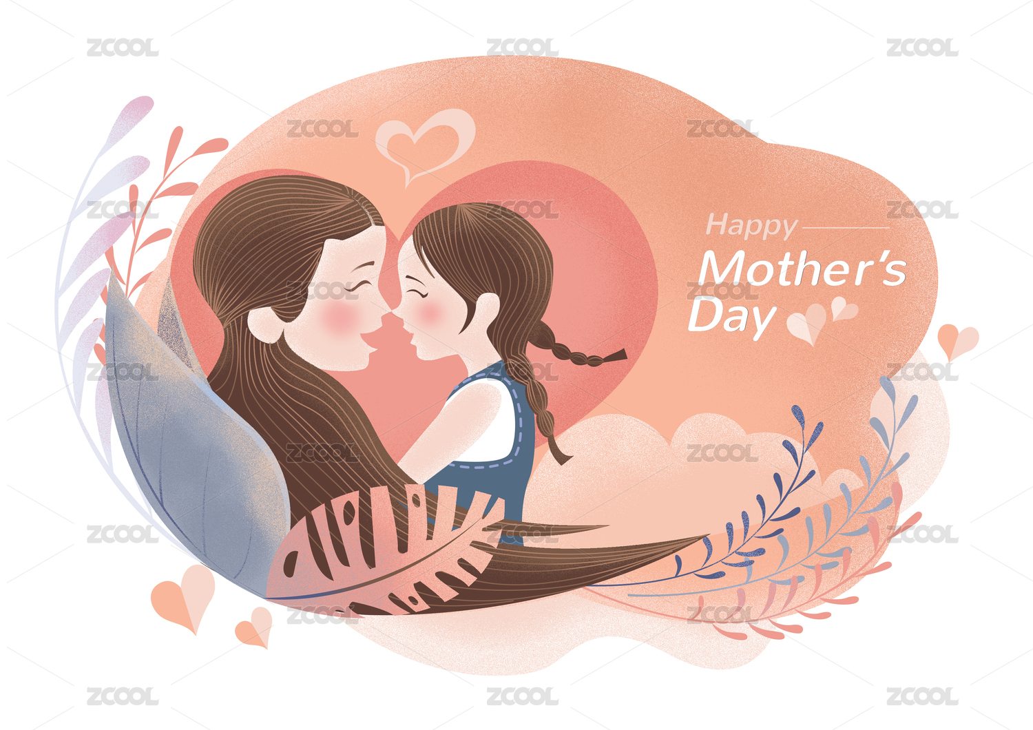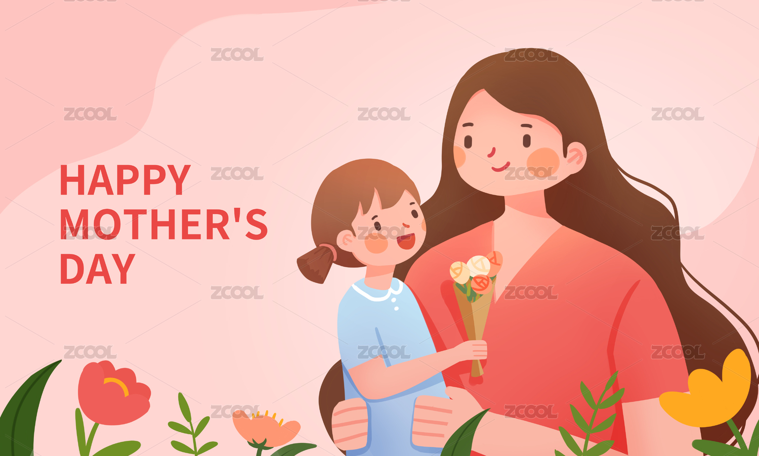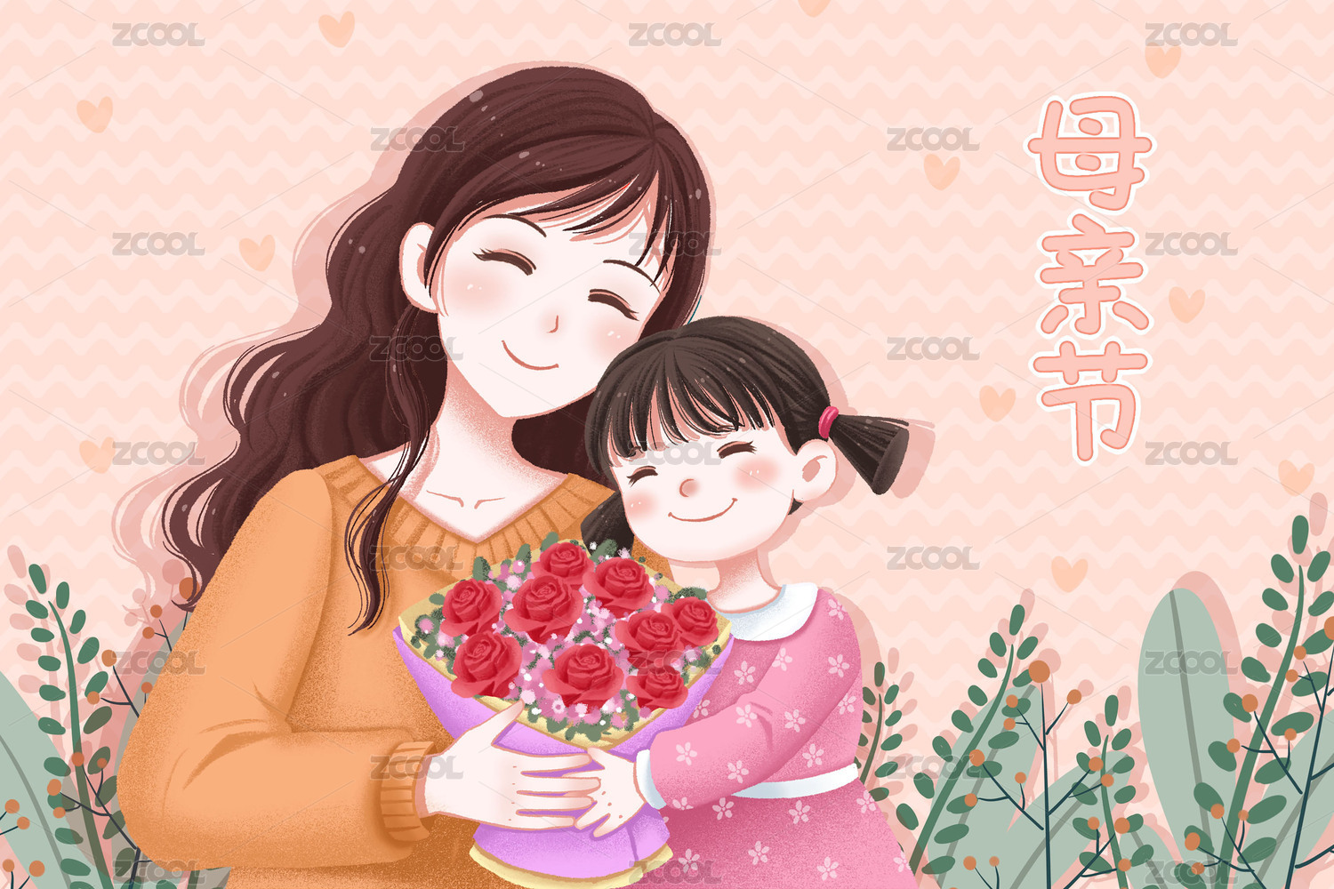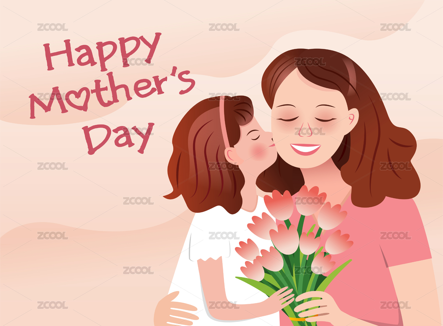 母亲节小女孩吻妈妈给妈妈送花矢量扁平插画