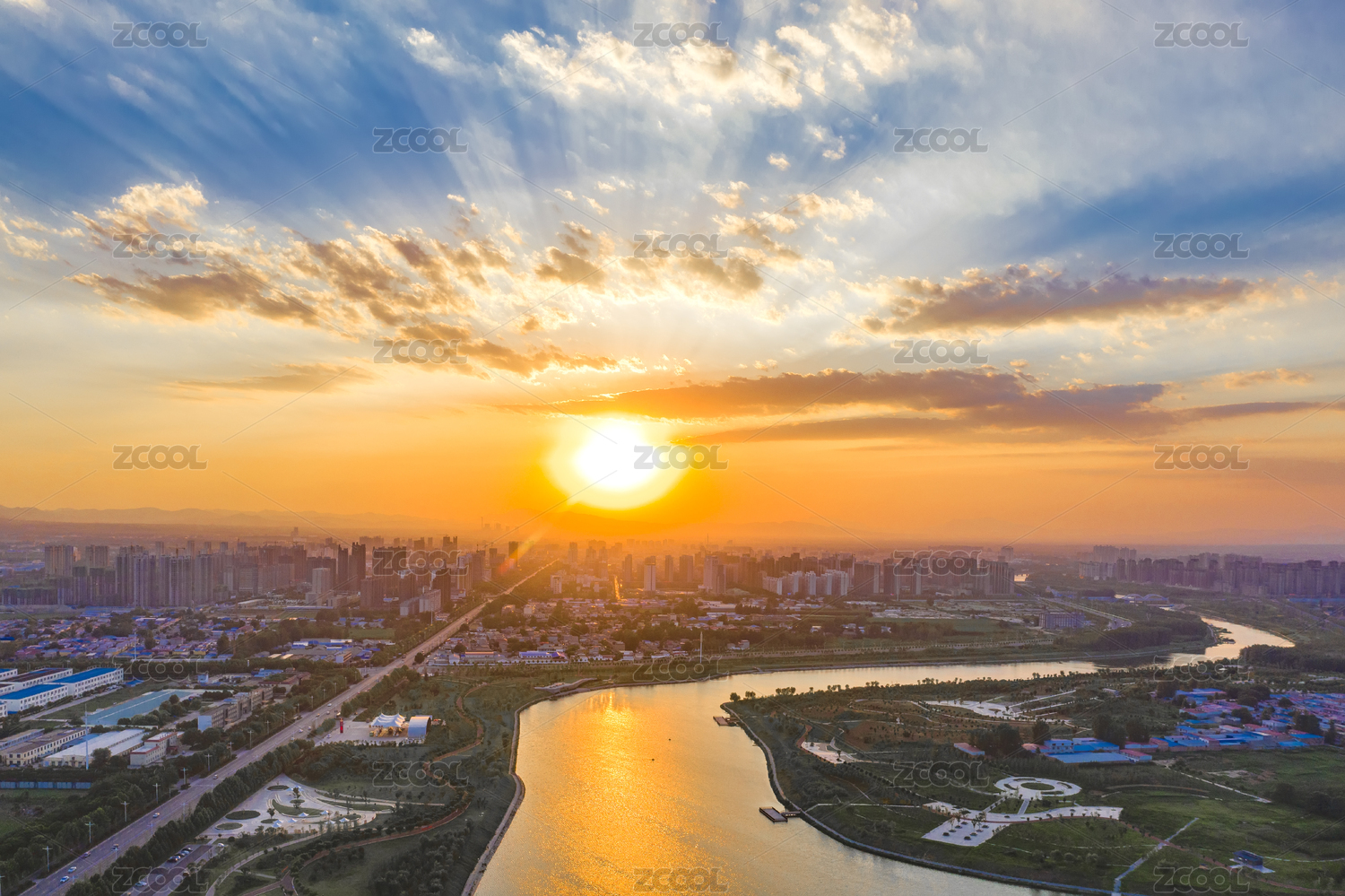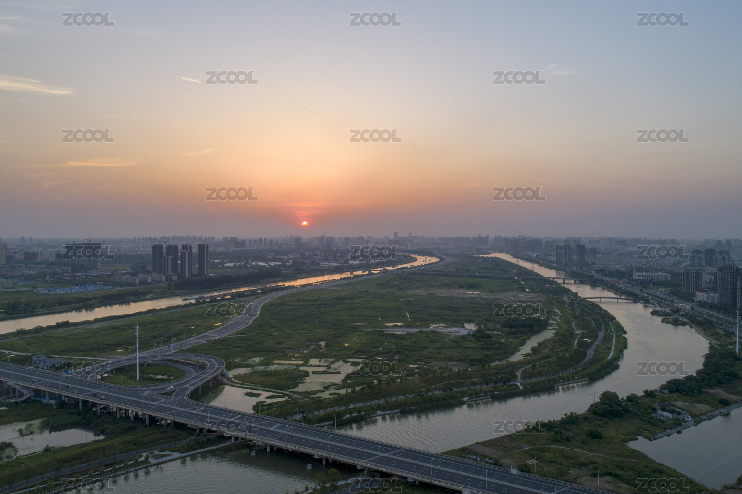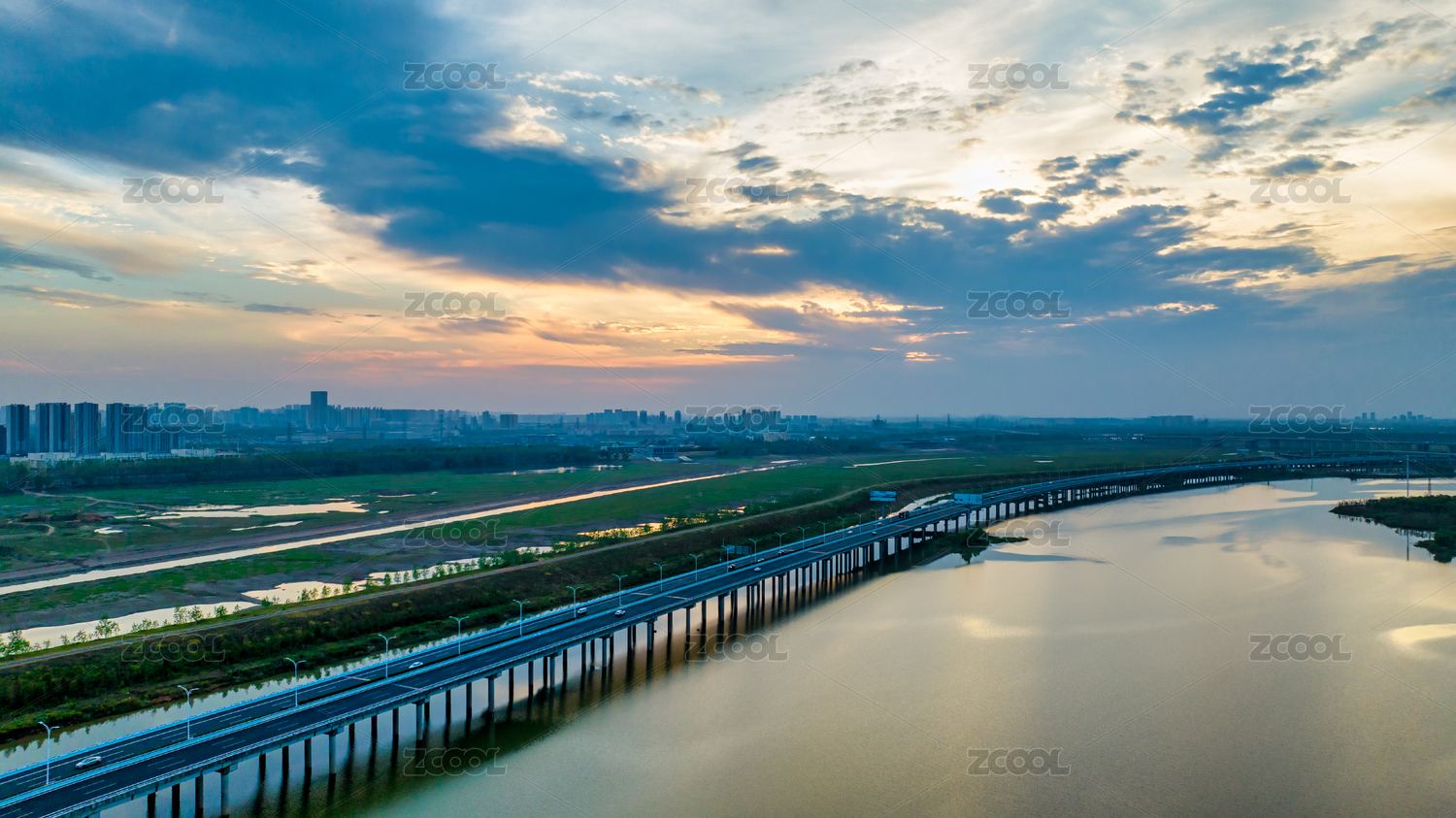 航拍中国河南省禹州市颍河两岸日落景观