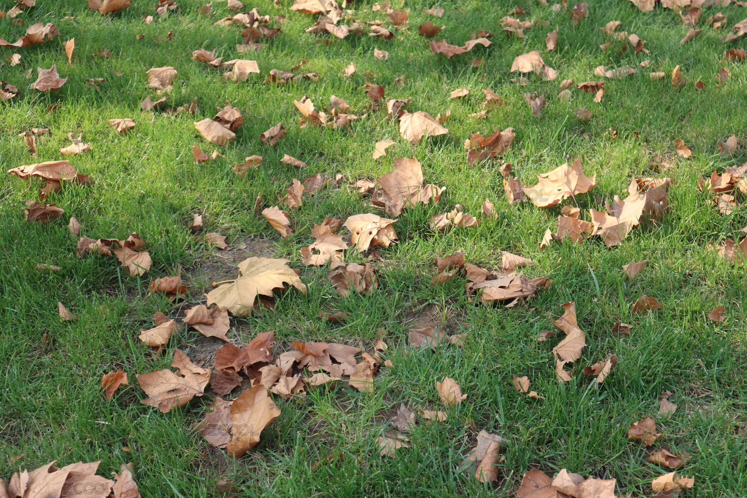 绿色草坪上的黄色落叶