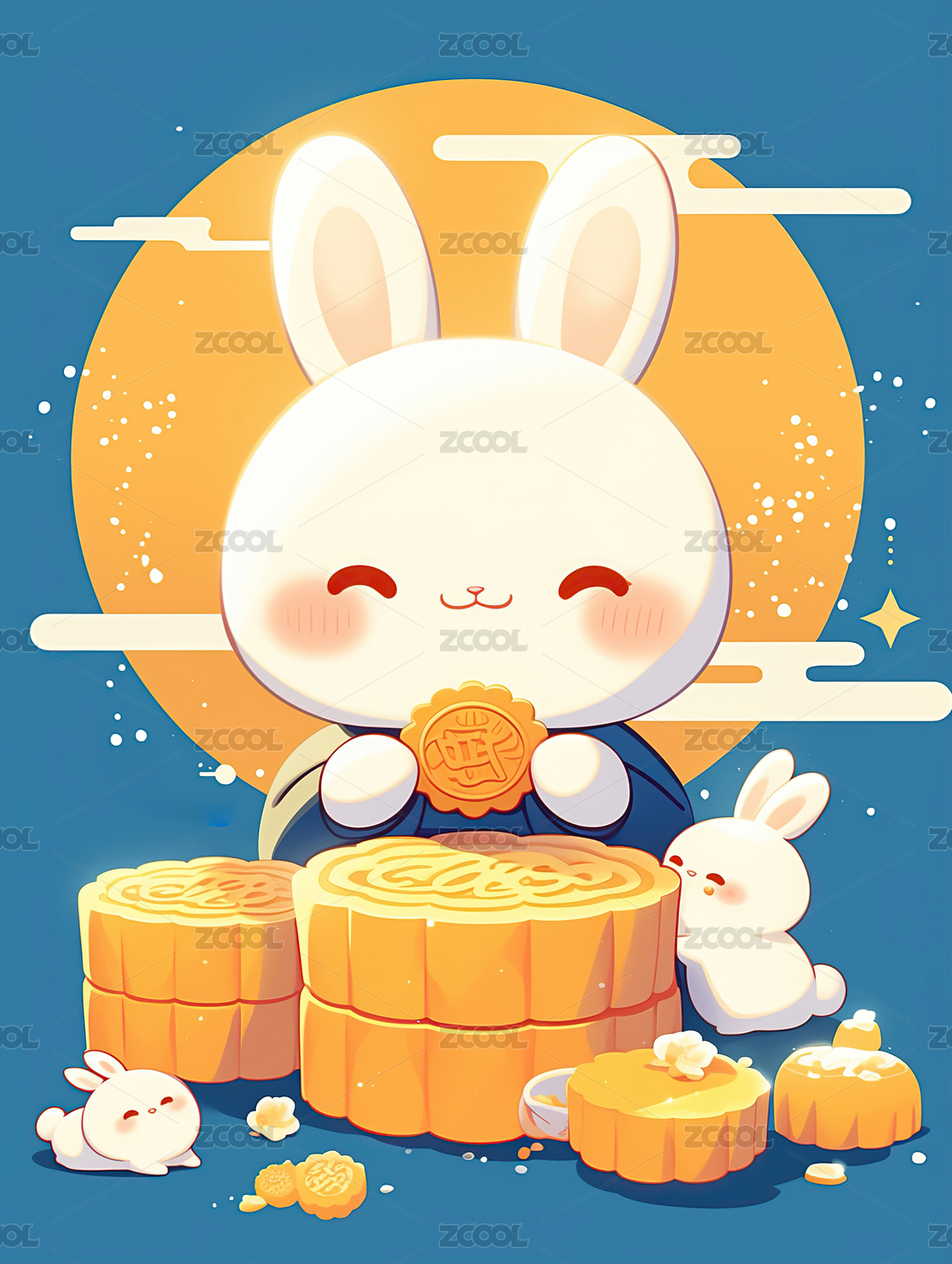 AIGC202403,玉兔,月亮,月饼,兔子,兔,插画,背景,卡通,扁平