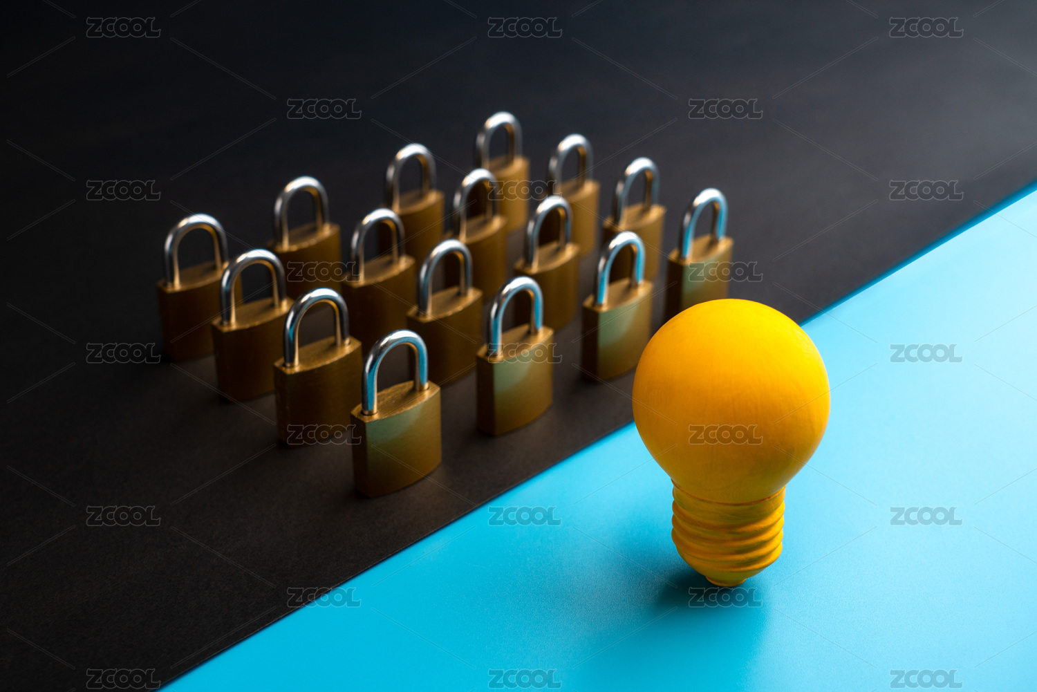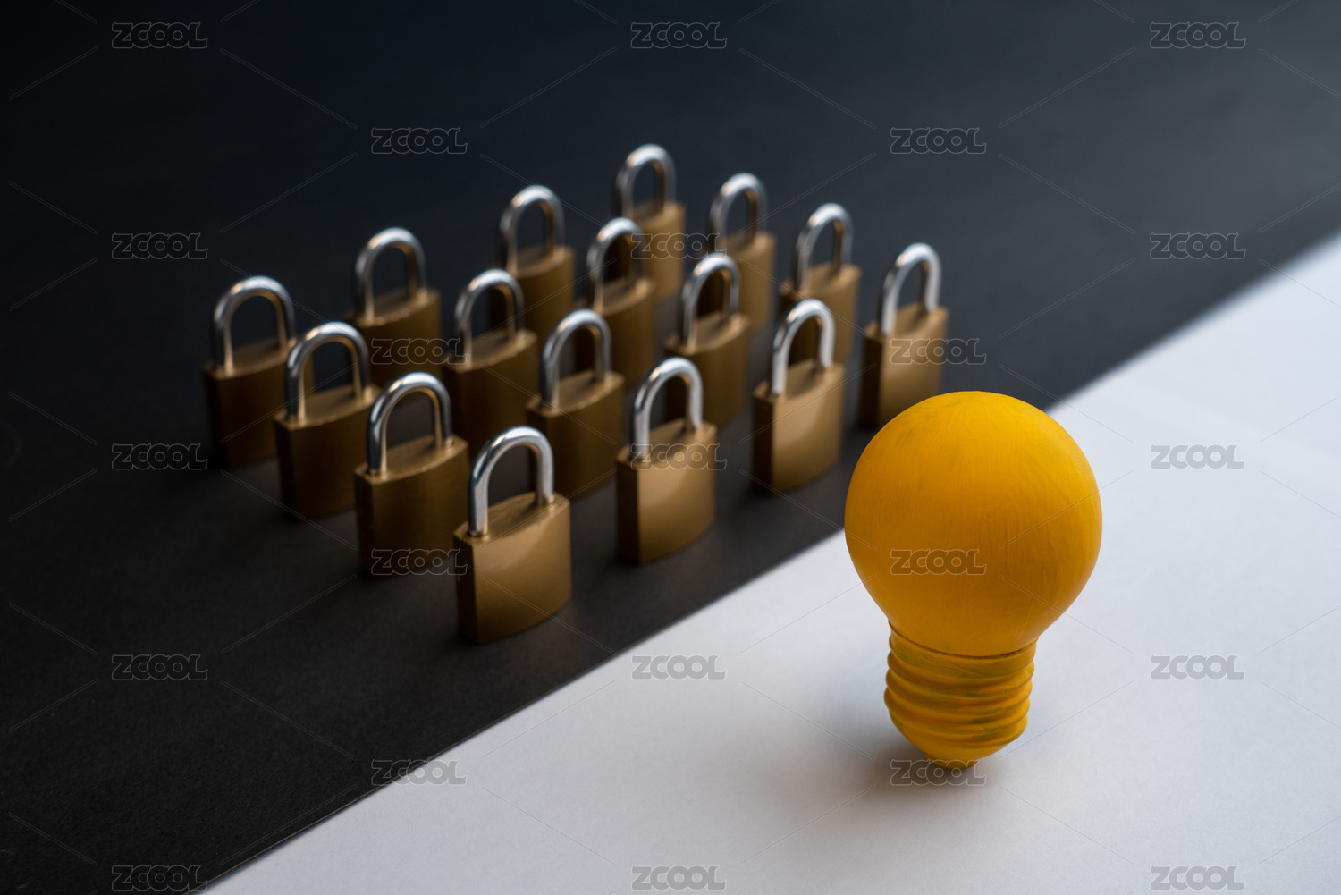 黑色背景下桌子上黄色灯泡和锁创意镜头