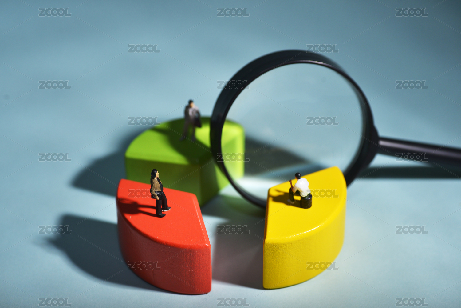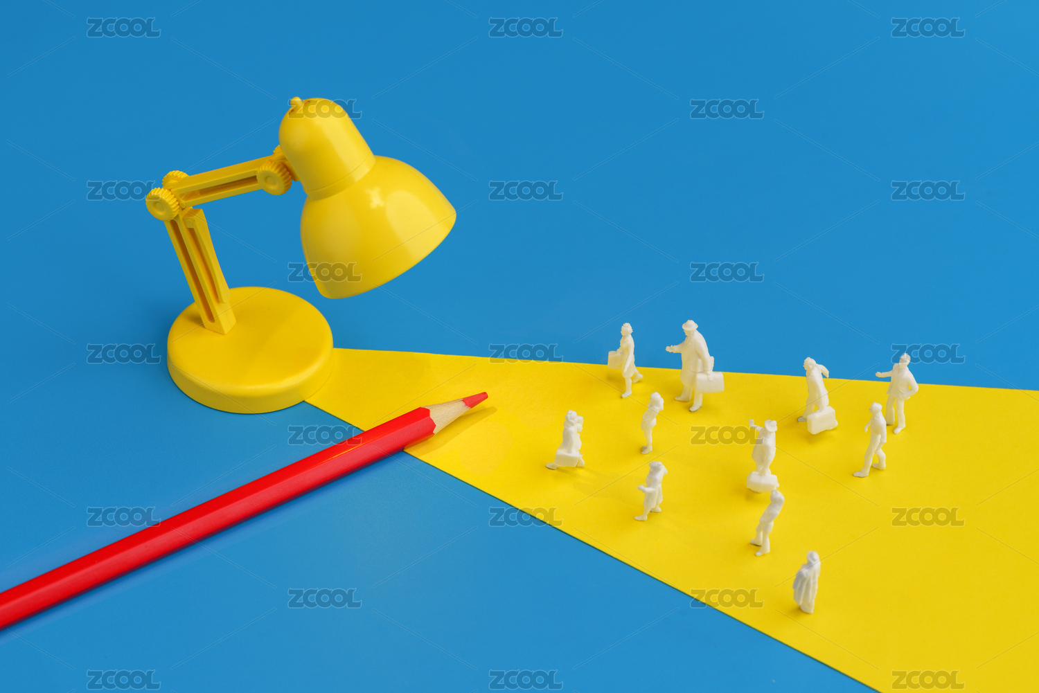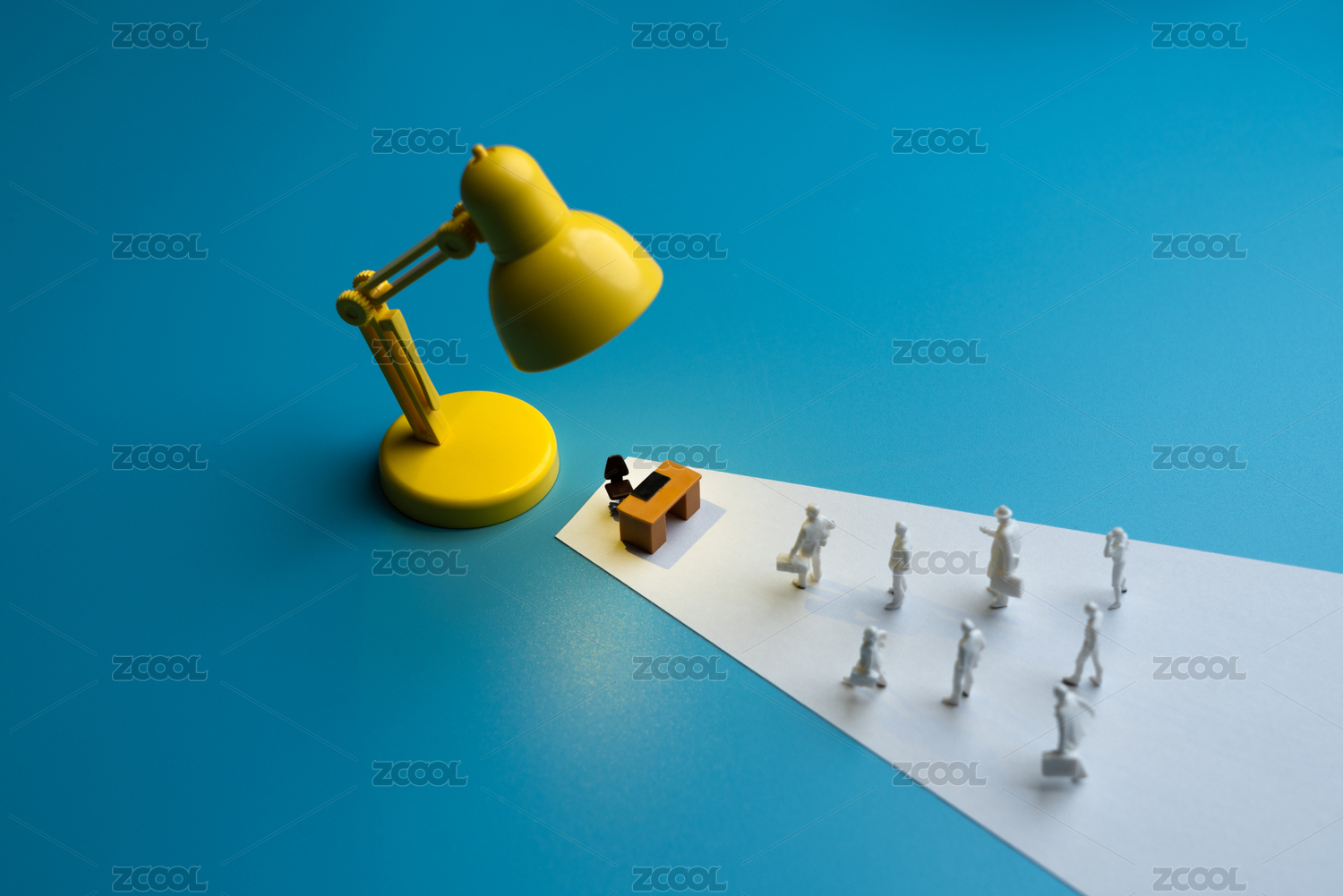 蓝色背景下台灯铅笔和面试人群微缩创意图