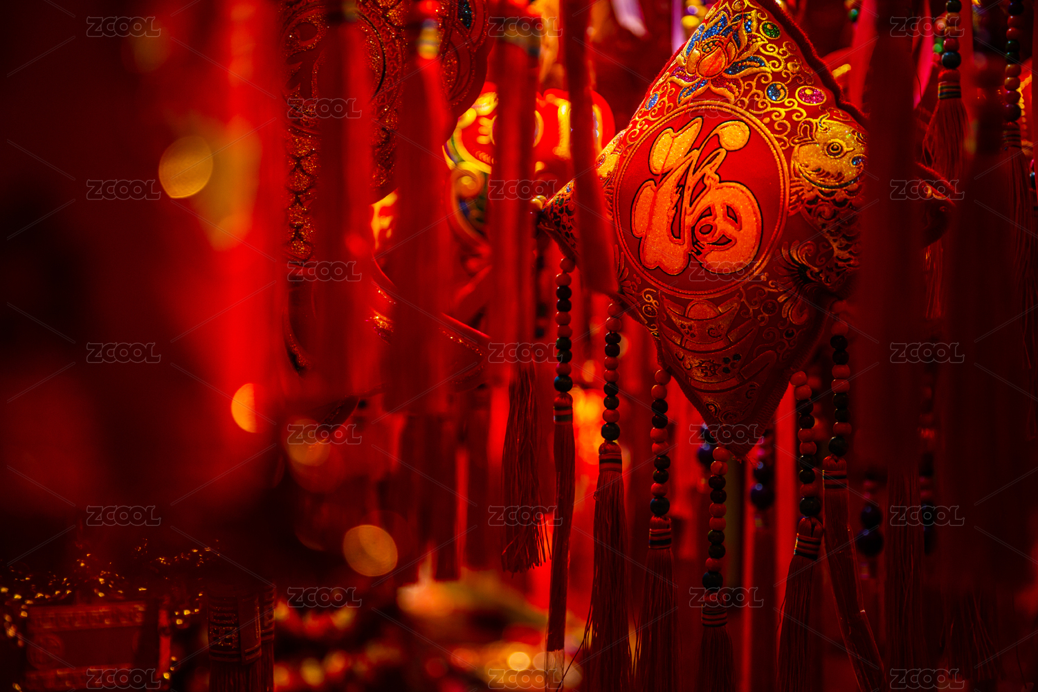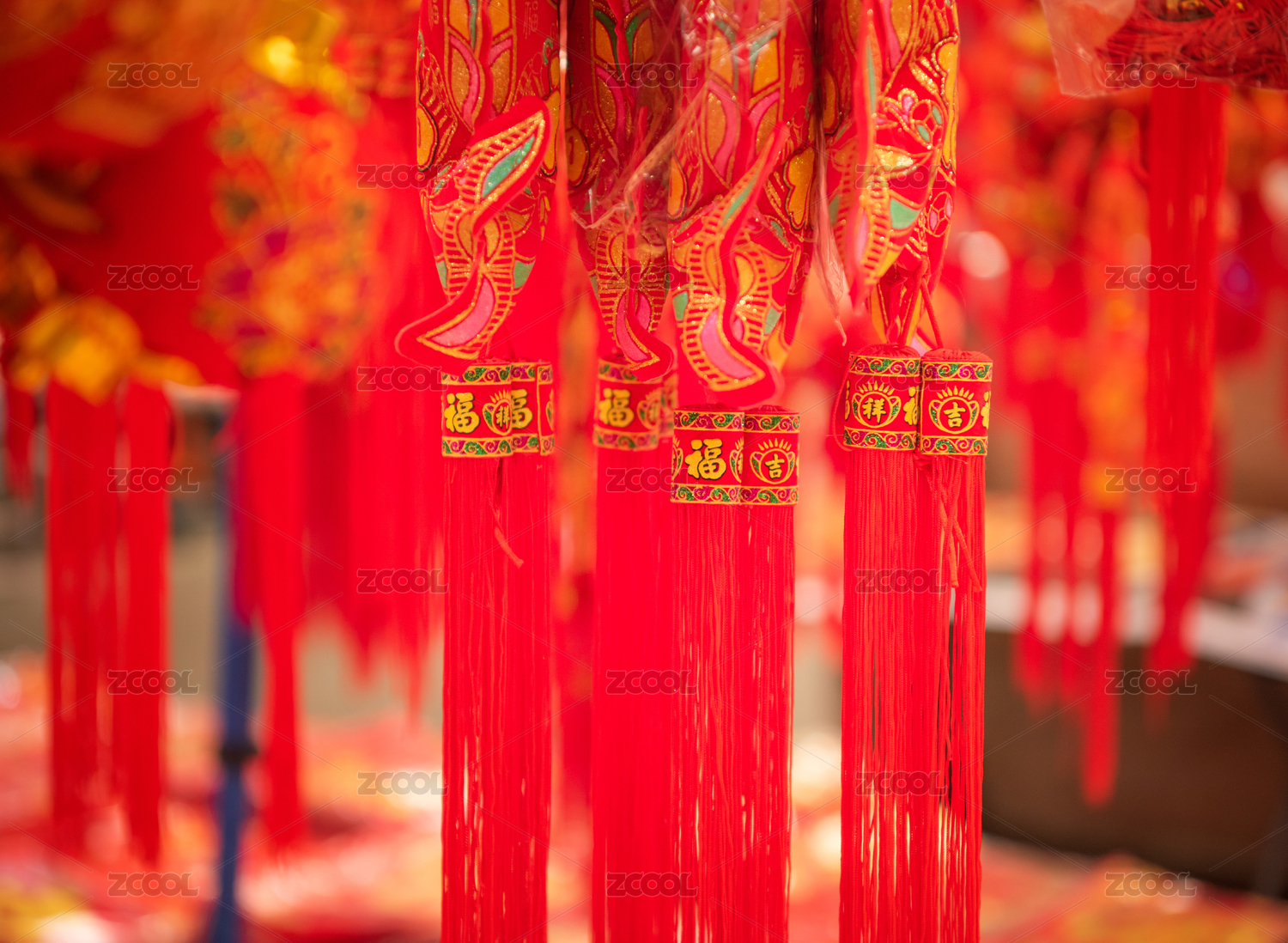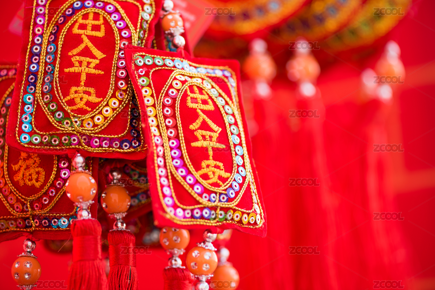 红色春联背景前的流苏挂件