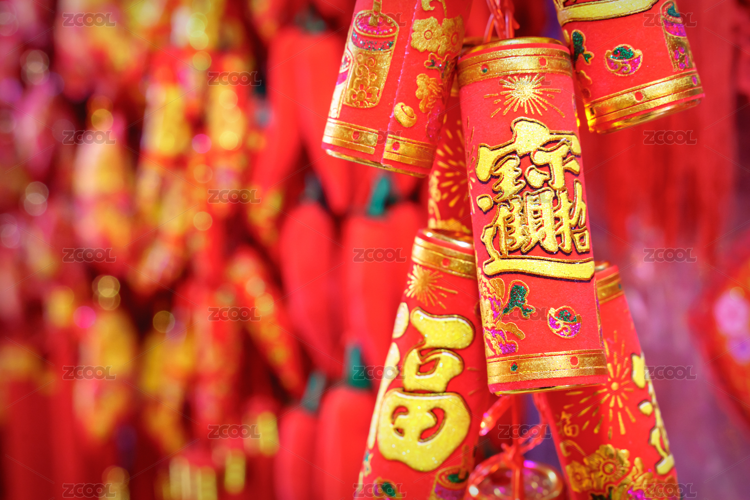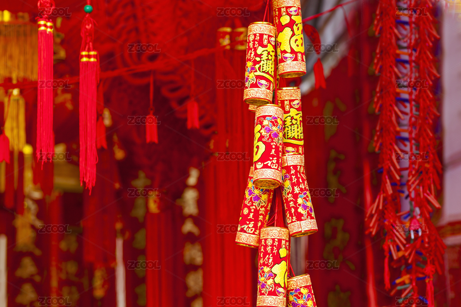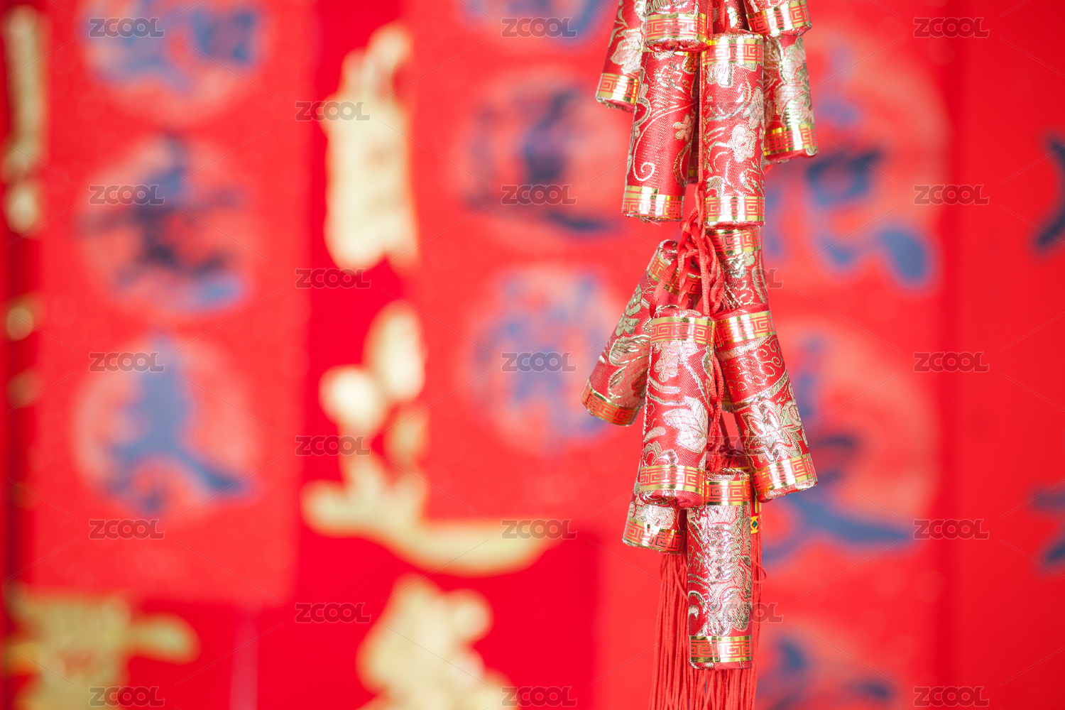 红色的鞭炮挂件挂在红色对联背景前