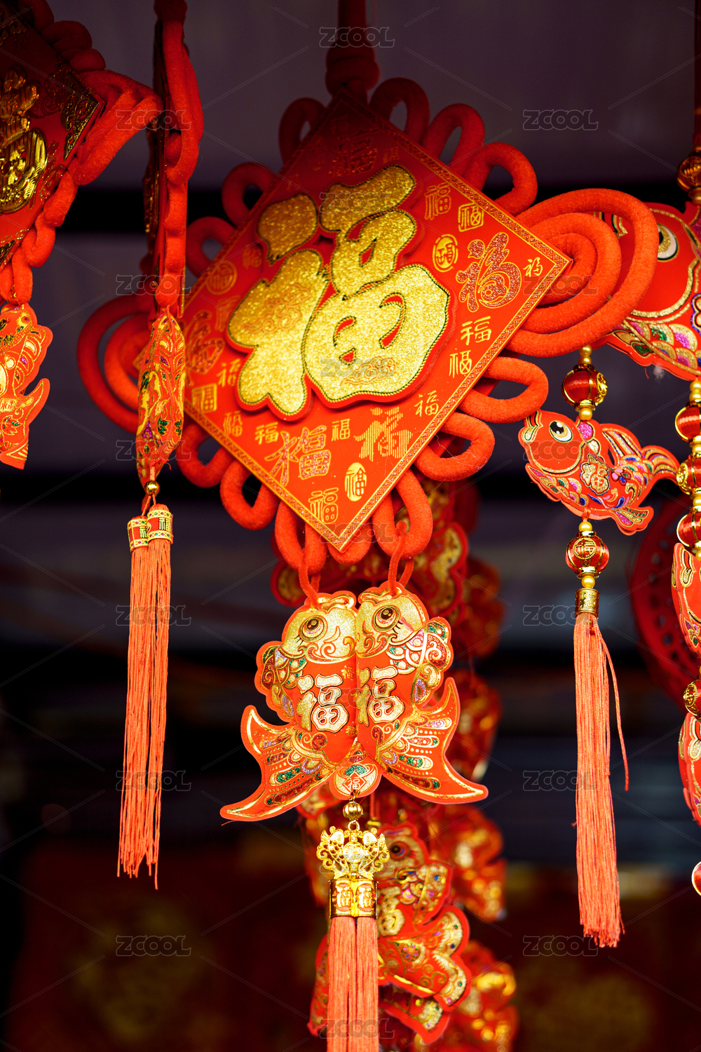 挂在市场上的福字喜庆饰品特写镜头
