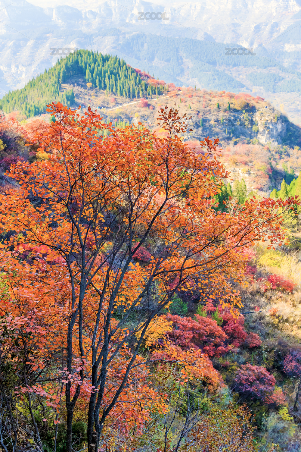 深秋山坡上的彩色灌木林,中国山东省青州市天赐山