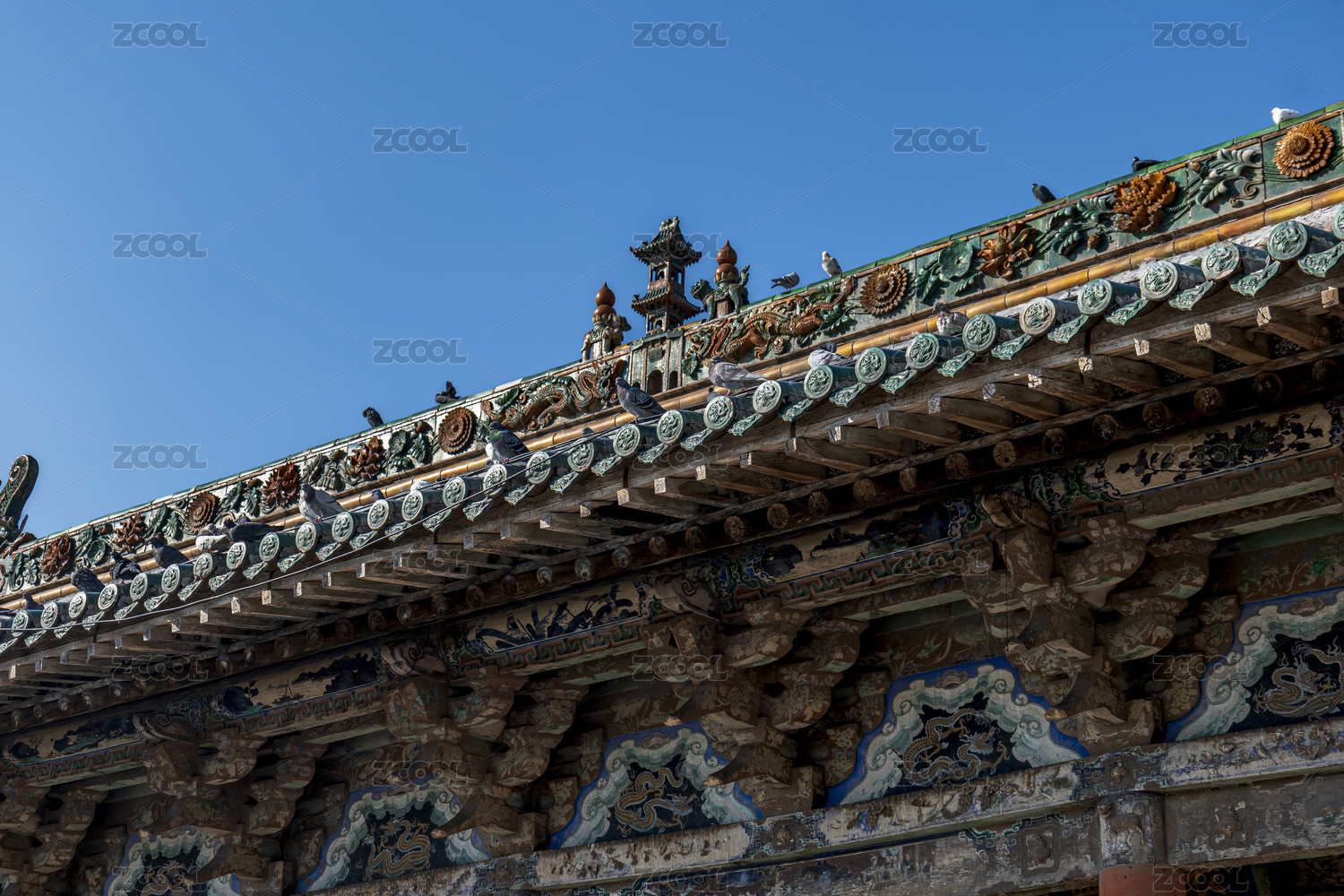 山西省平遥古城城隍庙内的古建筑彩绘屋檐斗拱构件